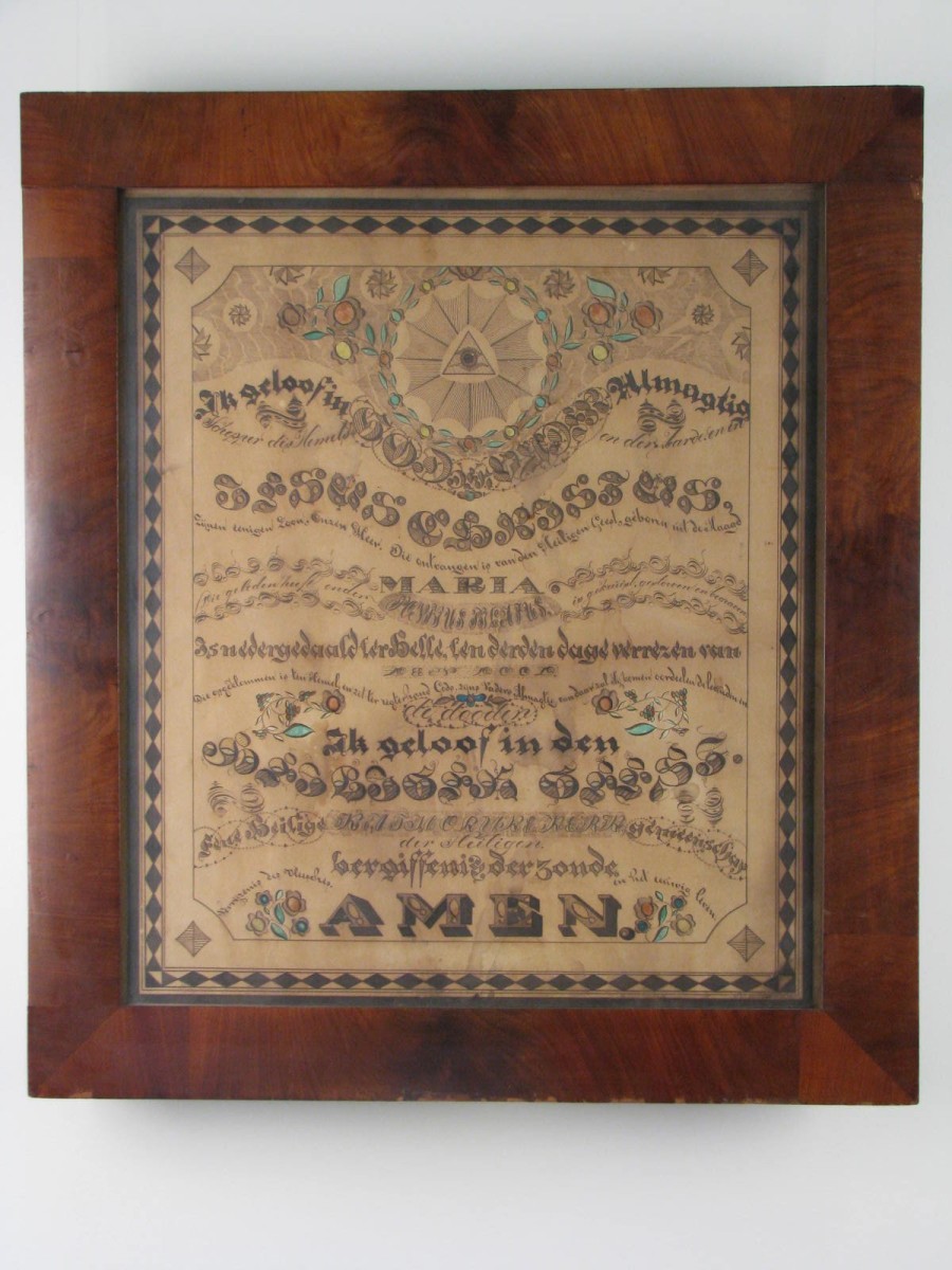 Alziend oog waaronder in verschillende lettertypes in kalligrafie de twaalf artikelen van het geloof, geloofsbelijdenis, ingelijst
