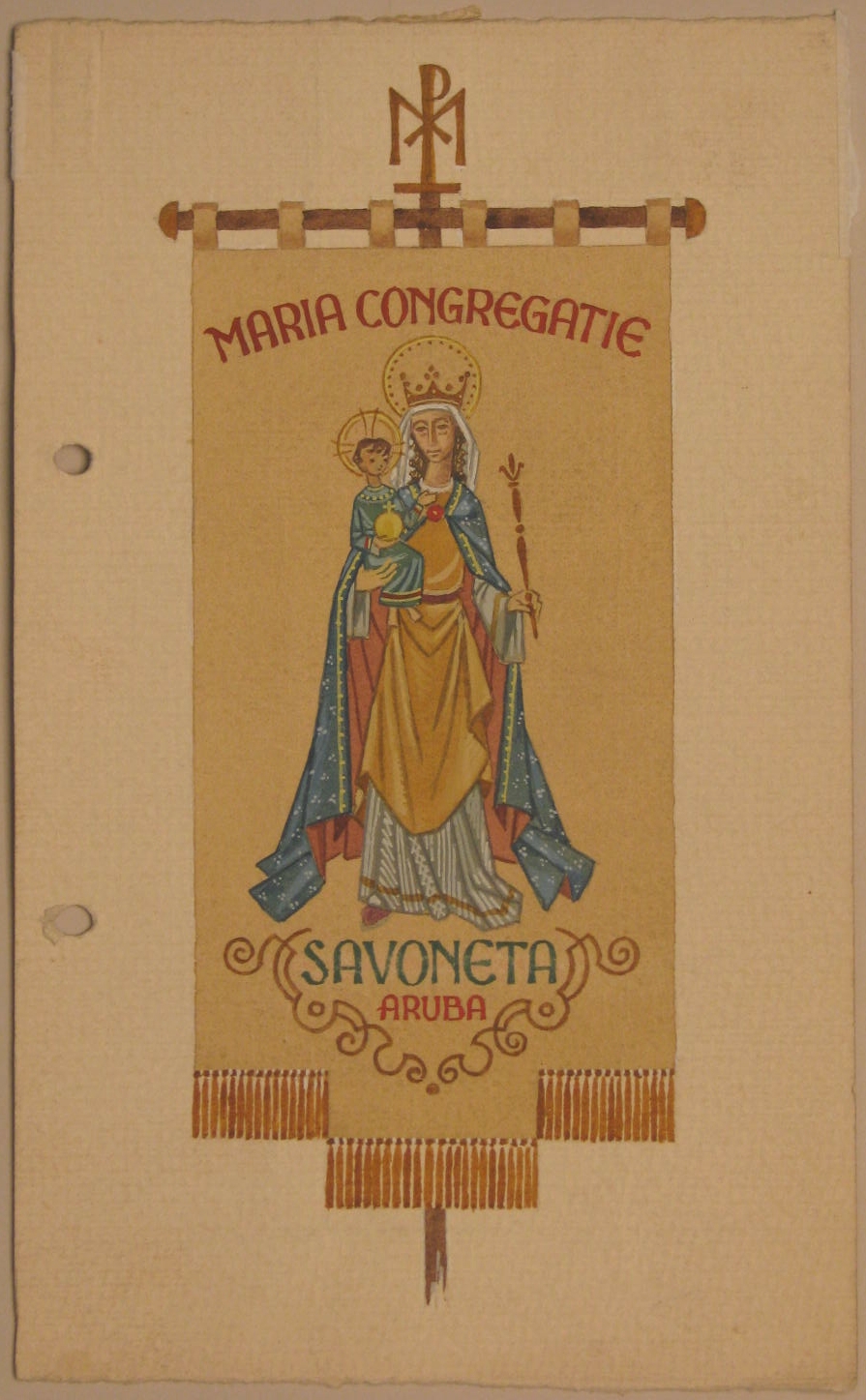 Ontwerp vaandel met Maria met kind, met "Mariacongregatie Savoneta Aruba", kz. fragment ontwerp mantel