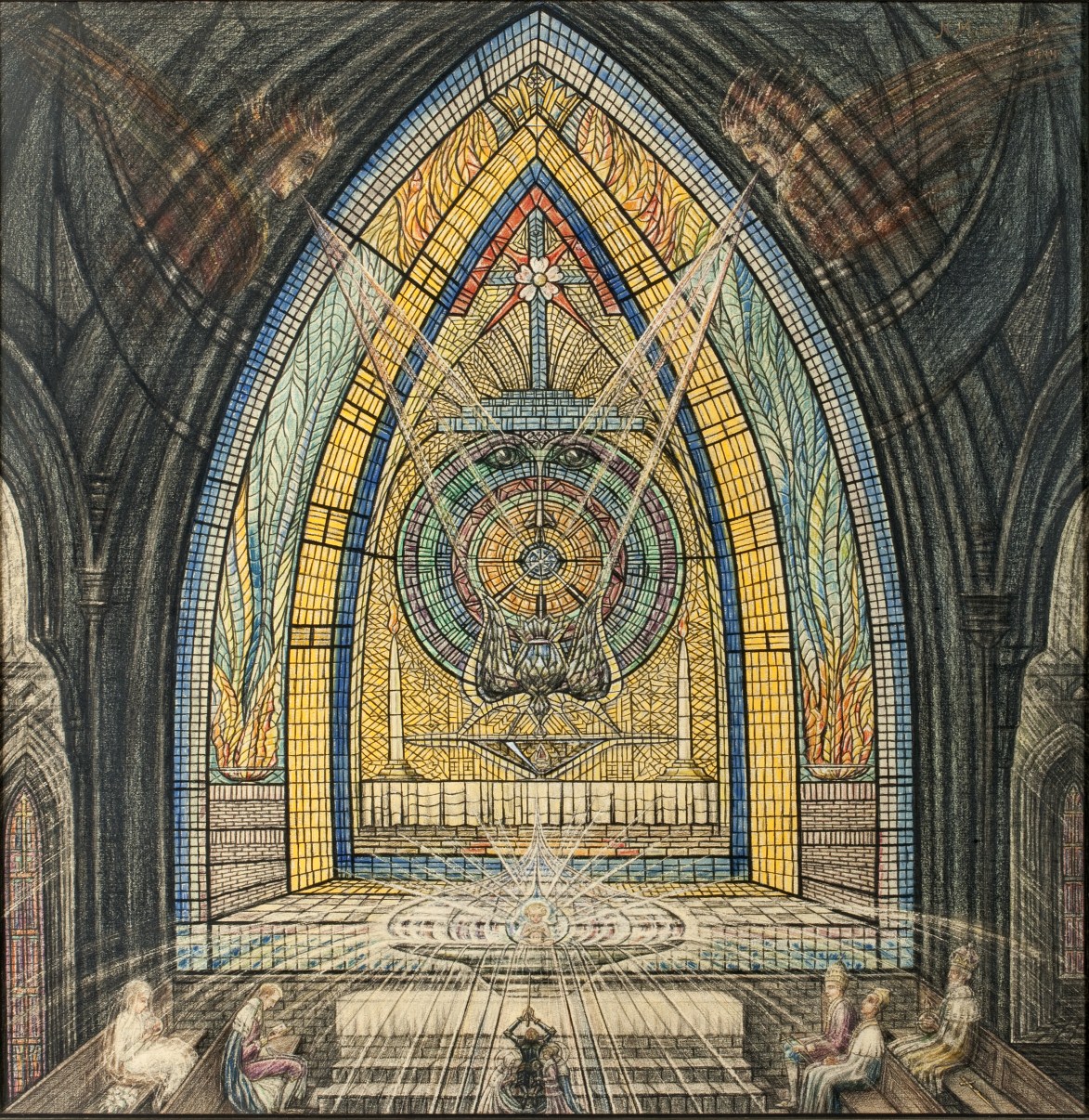 Symbolische voorstelling van de zoektocht van de mens naar zijn bestemming: Onderaan de tekening in een brede krachtstroom, komende vanaf de graal op het altaar, ligt Fietje, als aardse persoonlijkheid geknield, in harnas gehuld als strijder, haar zwaard opheffend in beide handen en daarop zegen vragend.