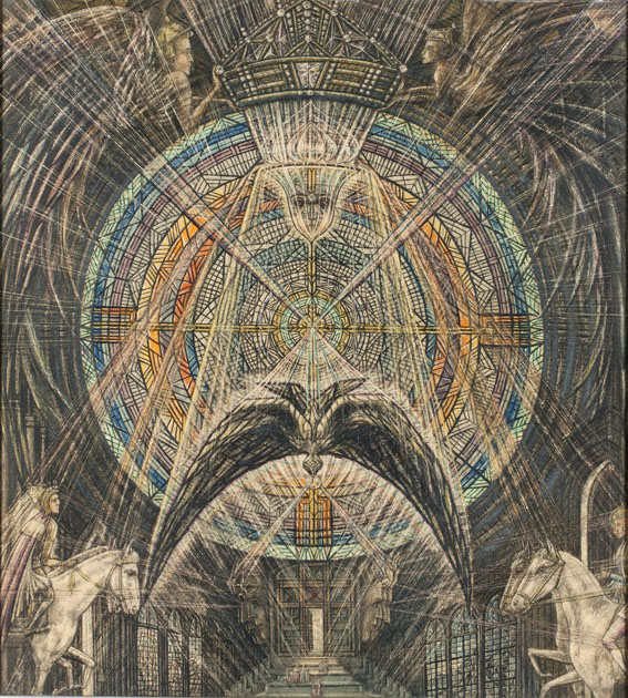 Symbolische voorstelling met engelfiguren in de bovenhoeken, grote vogel in het midden en ruiters in de onderhoeken. Op de achterzijde een etiket met "38" in blauw potlood.