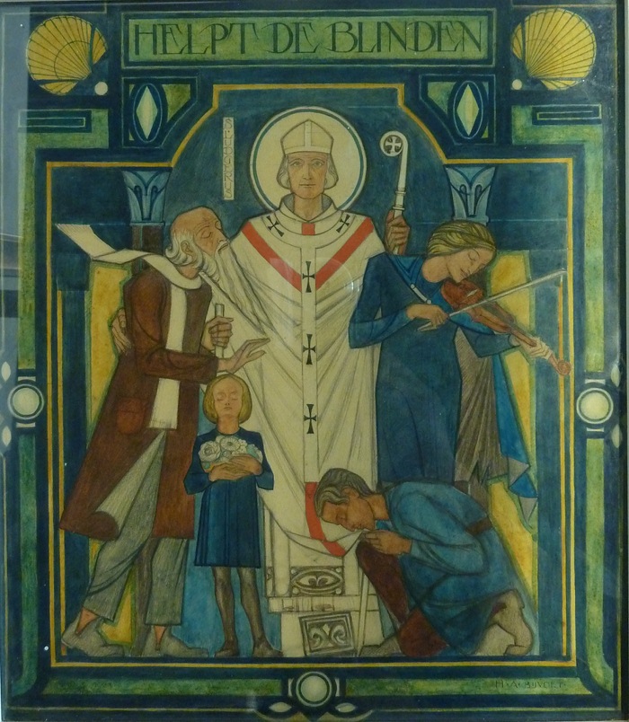 St. Ludger als beschermheilige met opschrift "Helpt de blinden", van de Roomsch Katholieke Vereeniging van Blindenvrienden Sint Ludger, ontwerptekening(?)