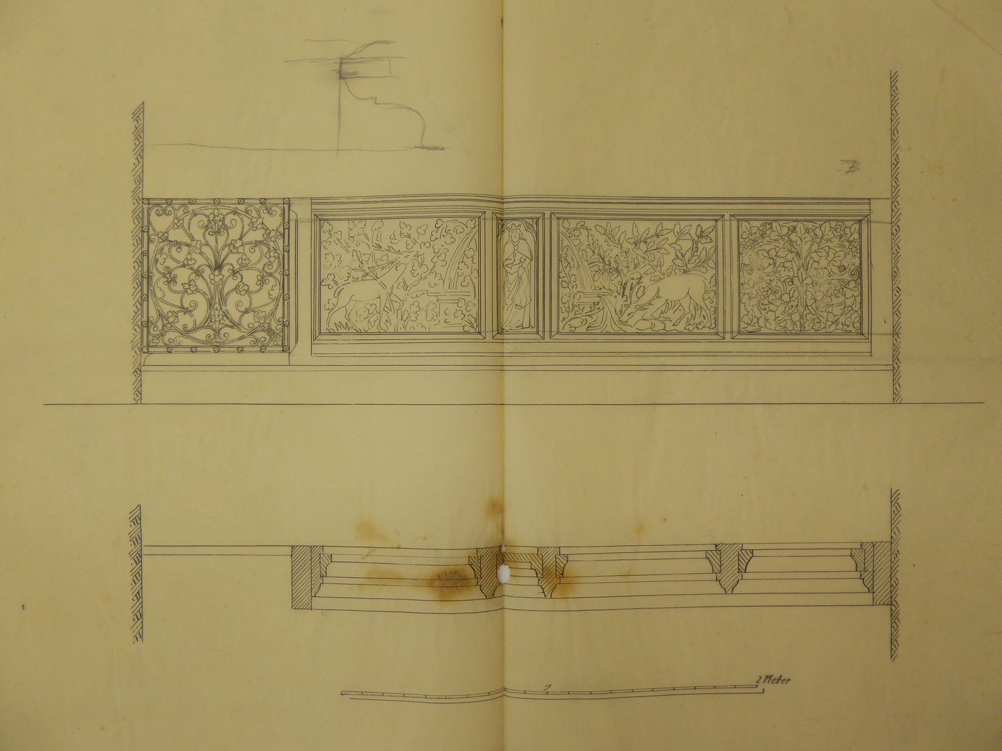 Communiebank met herten en bloemmotieven en bladornamenten (zicht van voren en van boven af)