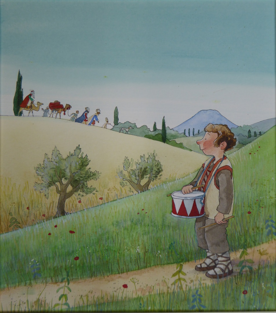 Ontwerptekening nr. 1 voor boekomslag 'Angelino en de drie koningen': Angelino met trommel, drie koningen in landschap op achtergrond