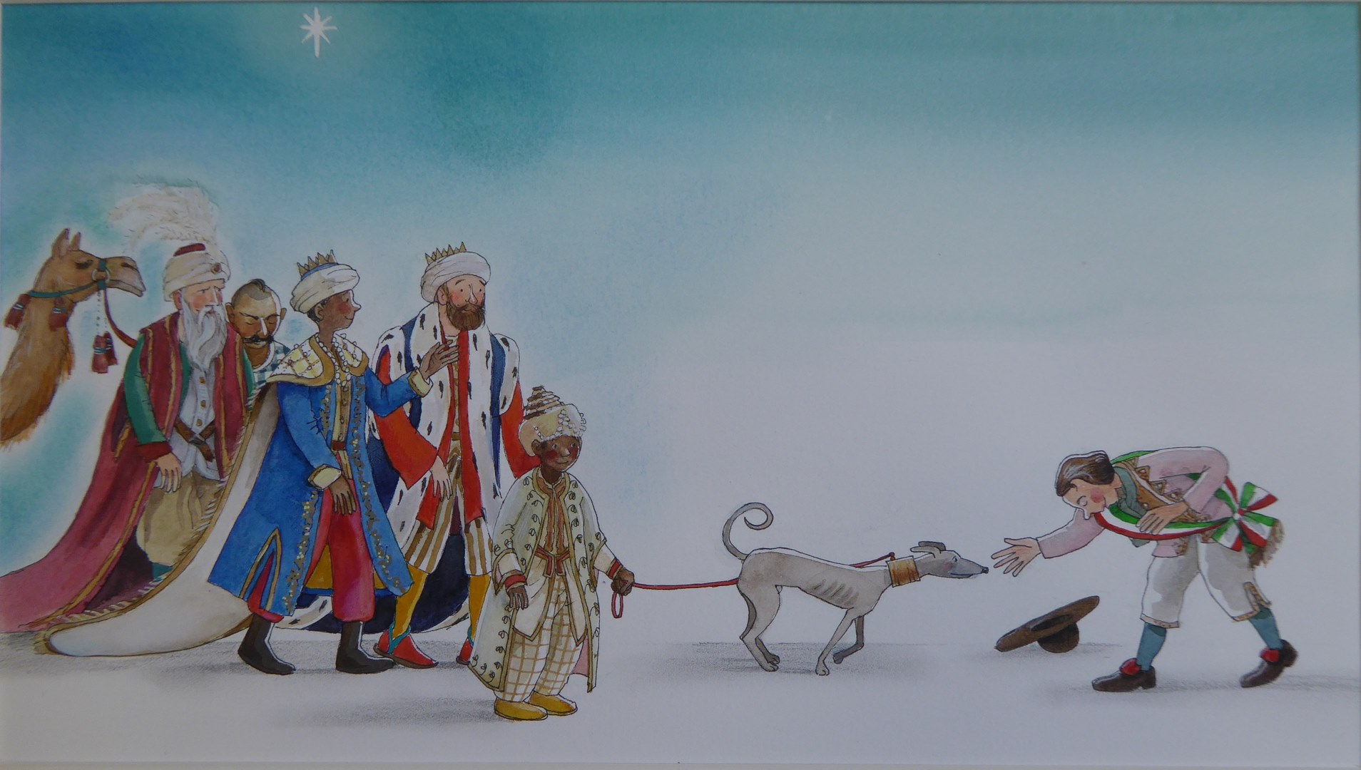 Ontwerptekening nr. 9 voor boek 'Angelino en de drie koningen': Burgemeester Baffi maakt een diepe buiging voor de drie koningen