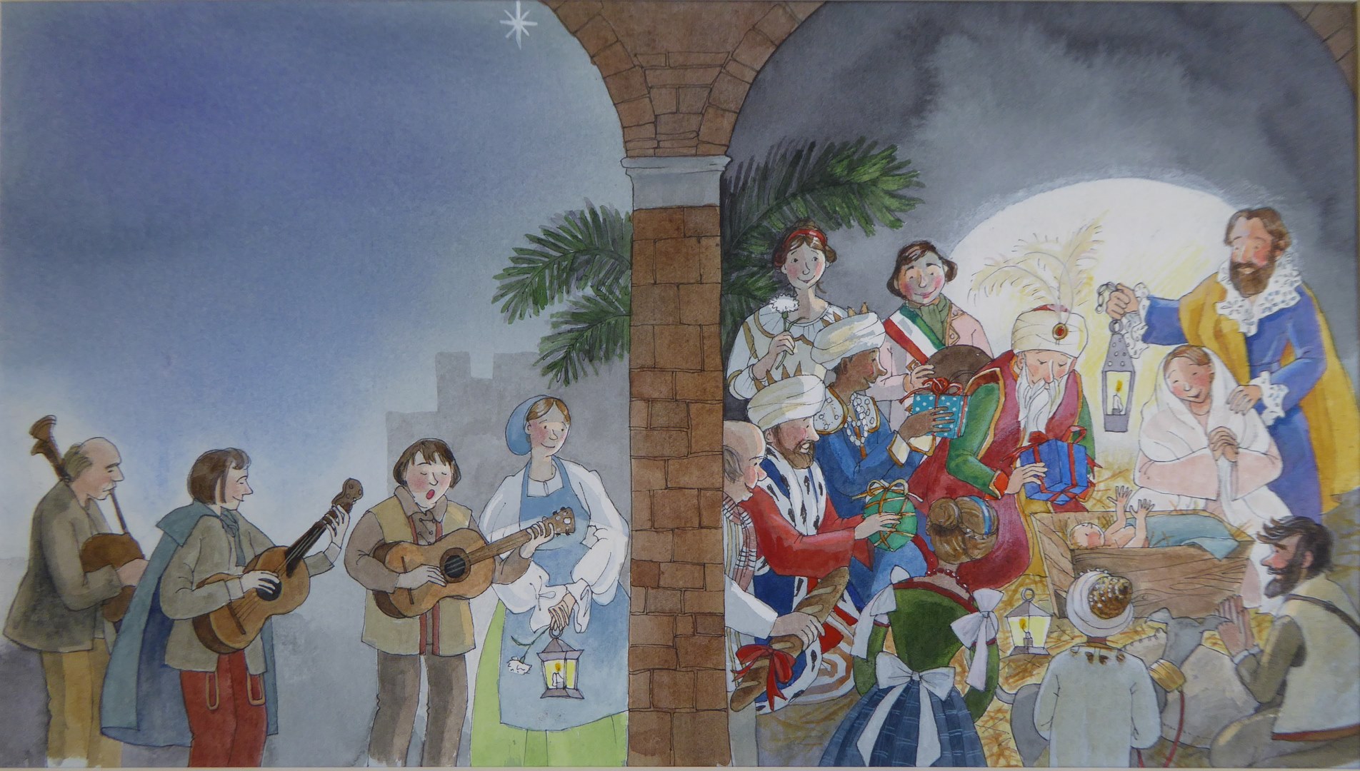 Ontwerptekening nr. 13 voor boek 'Angelino en de drie koningen': Aanbidding van de drie koningen met links muzikanten