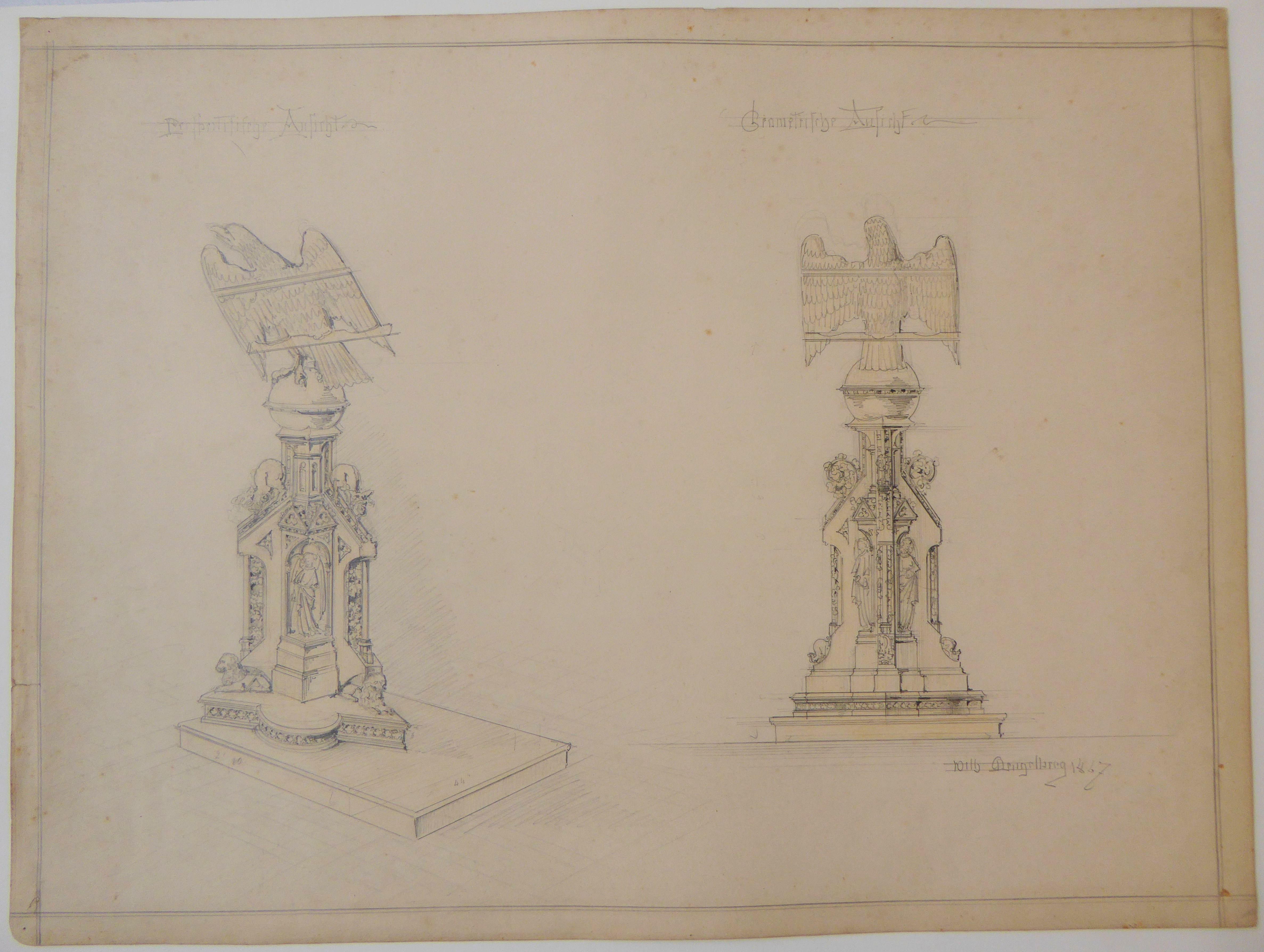 Twee schetsen van een lezenaar met arend, met op de voet twee figuren