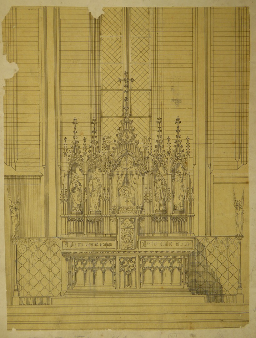 Altaar versierd met afbeeldingen van vier bisschoppen
