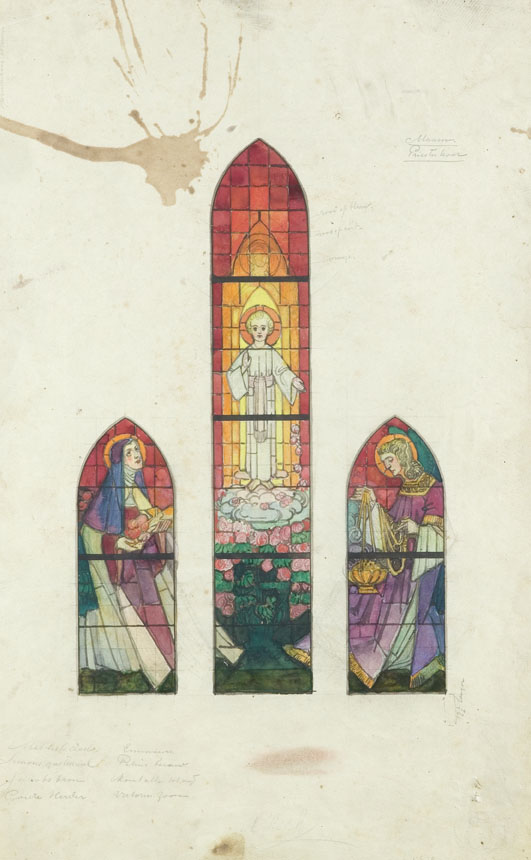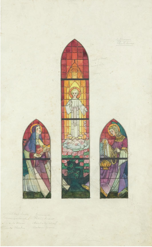 Ontwerp drie glasramen met Theresia, Christuskind en engel (Maarn, St. Theresiakerk)