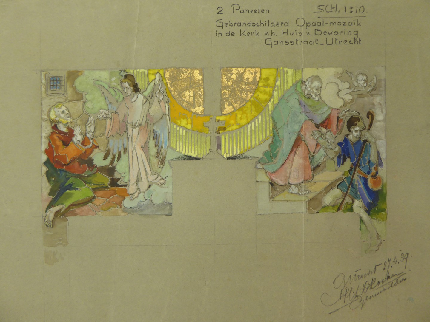 Ontwerp opaline mozaïek met Petrus in de kerker en de verloren zoon (Utrecht, huis van bewaring)