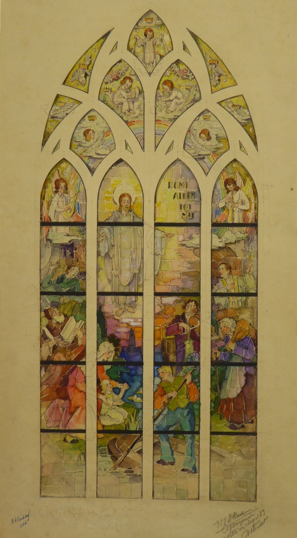 Ontwerp glasraam met komt allen tot mij (Utrecht, kapel R.K. kerkhof)