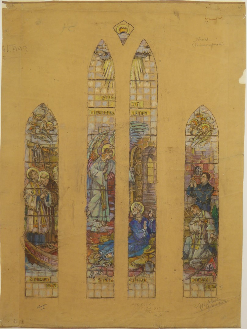 Ontwerp drie glasramen met twee martelaren van Gorcum, Petrus' bevrijding uit de gevangenis, pastoor Galama (Utrecht, St. Ludgeruskerk)