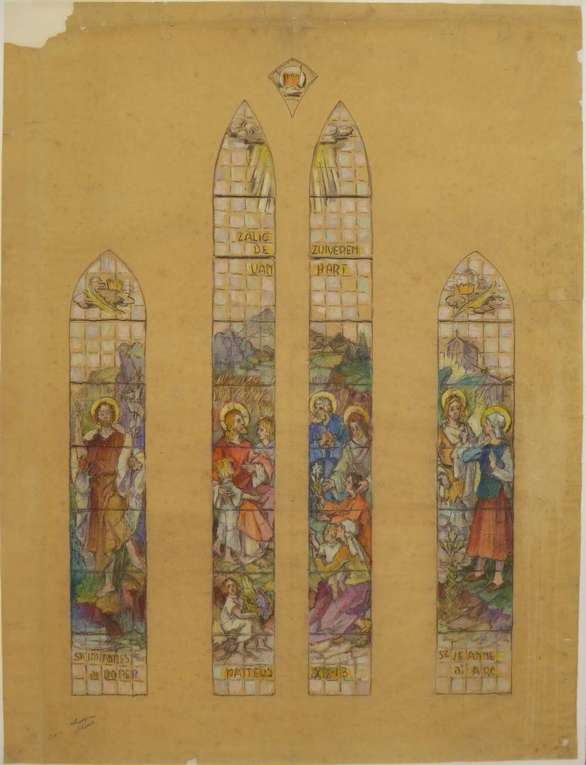 Ontwerp drie glasramen met Johannes de Doper, laat de kinderen tot mij komen, Jeanne d'Arc (Utrecht, St. Ludgeruskerk)