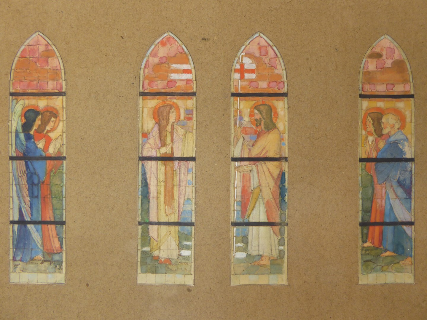 Ontwerp vier glasramen met Christus, Maria Magdalena, Petrus en Johannes en twee engelen (Utrecht, St. Ludgeruskerk)