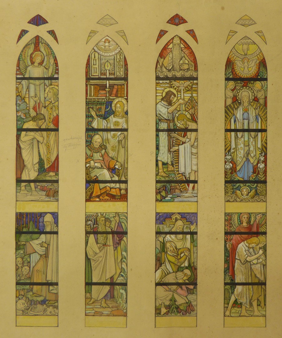 Ontwerp vier glasramen met o.a. doop kamerling, Ezechiel, Nicodemus (Utrecht, St. Martinuskerk)