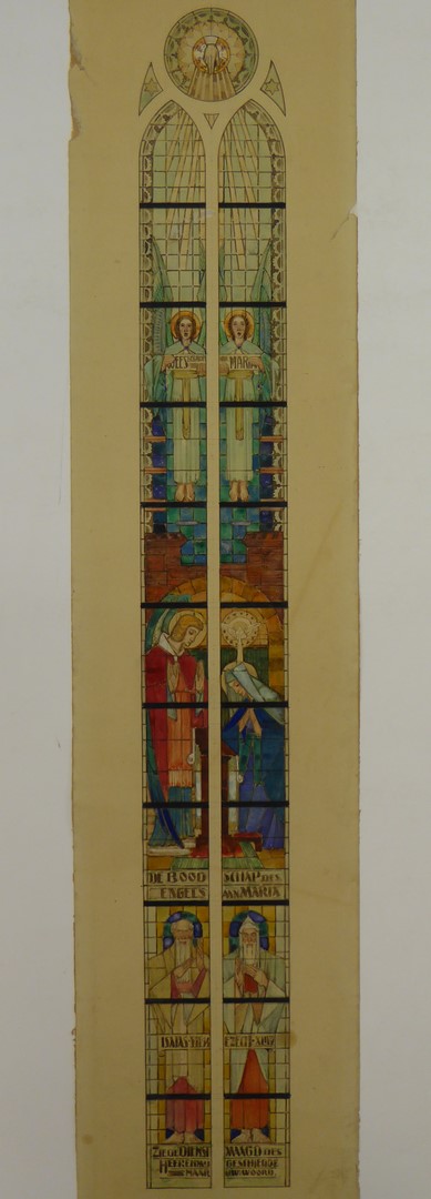 Ontwerp glasraam met annunciatie, Isaias en Ezechiel (Utrecht, St. Martinuskerk)