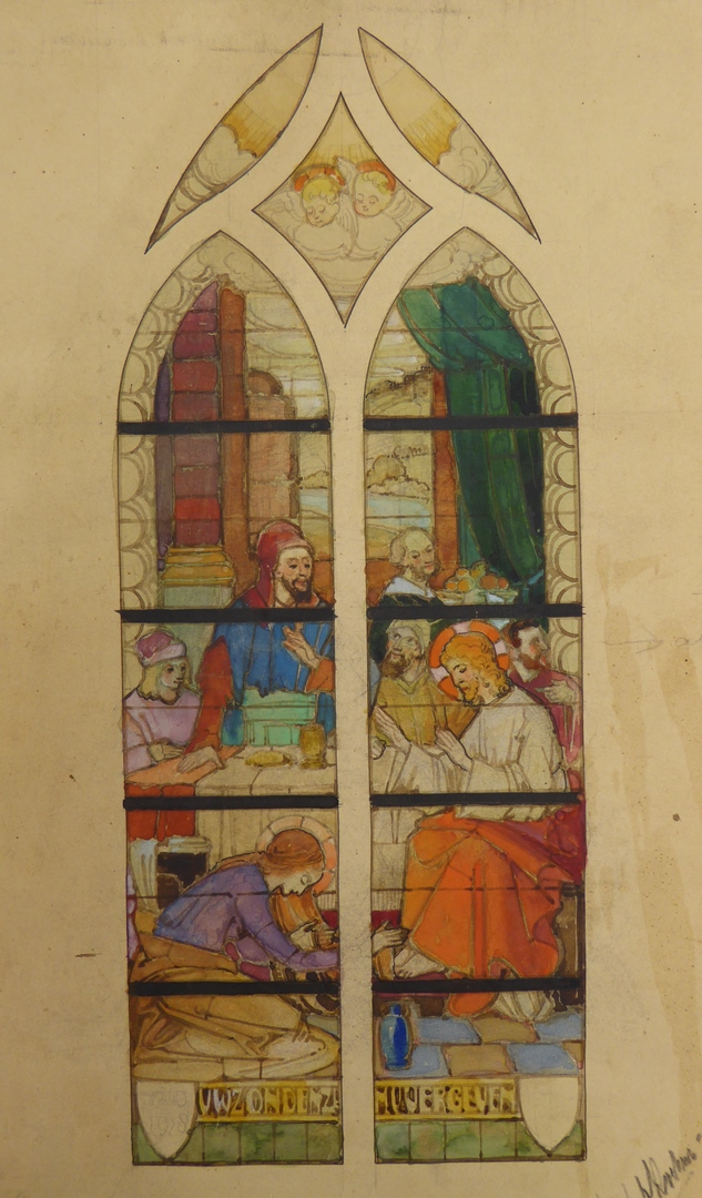 Ontwerp glasraam met Maria Magdalena en Christus (Werkhoven, Maria ten Hemelopnemingkerk)