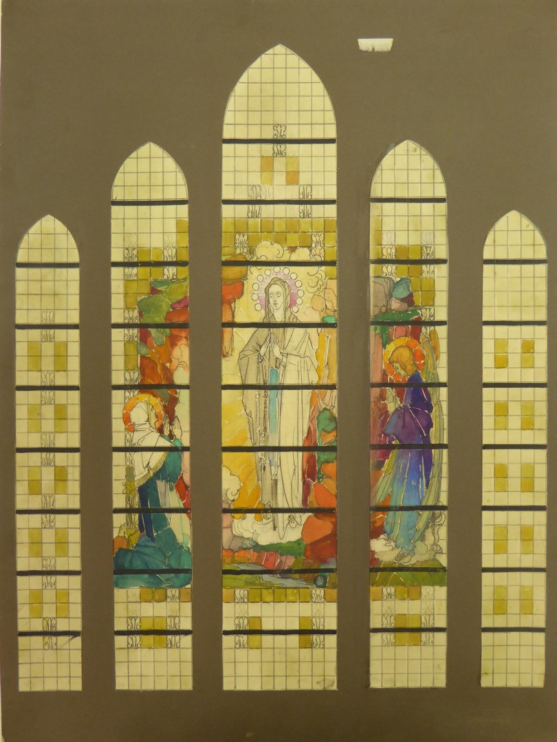 Ontwerp glasraam met verschijning van Maria aan Bernadette (Wijtgaard, O.L. Vrouw ten Hemelopnemingkerk)