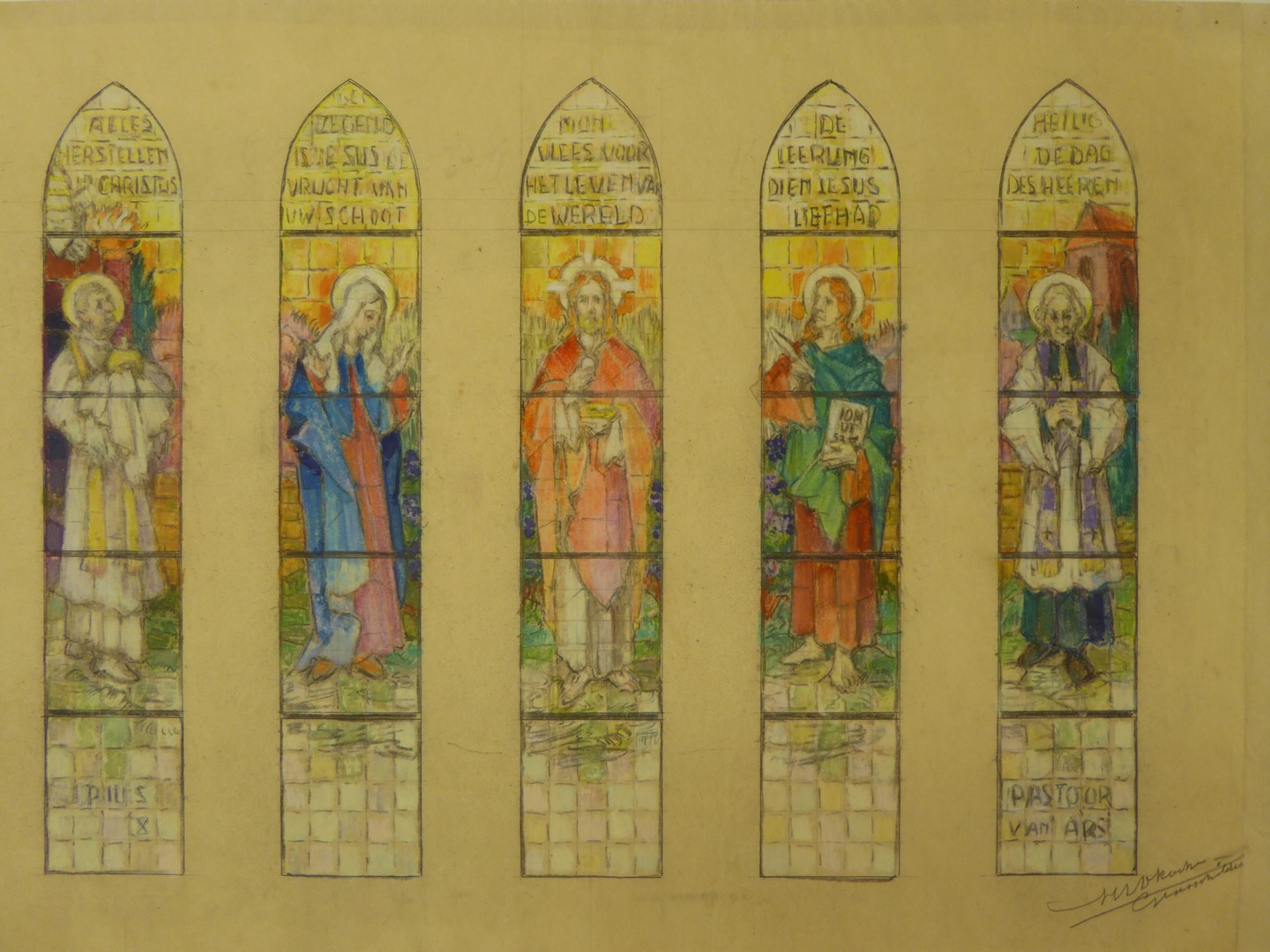 Ontwerp vijf glasramen met Pius X, Maria, Christus, Johannes en pastoor van Ars (Delfzijl, St. Jozefkerk)