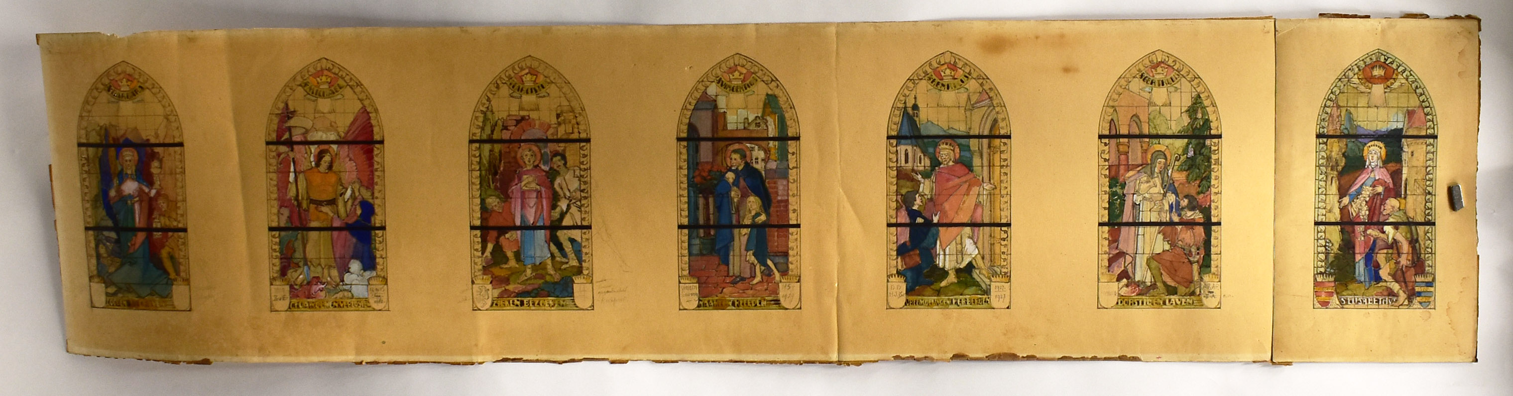 Ontwerp zes glasramen met o.a. Barbara, Michael, Tarcisius, met hieraan bevestigd het ontwerp RMCC te9.63 (Culemborg, St. Barbarakerk)
