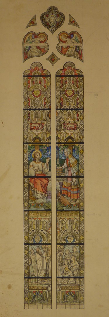 Ontwerp glasraam met Christus en de Samaritaanse vrouw, eronder Mozes (Delden, St. Blasiuskerk)