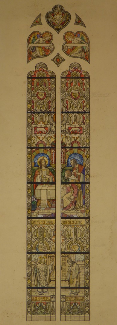 Ontwerp glasraam met Emmaus, en eronder Christus en Ezechiel (Delden, St. Blasiuskerk)