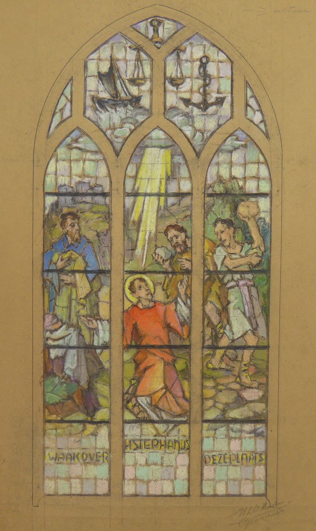 Ontwerp glasraam met de steniging van St. Stephanus (Delfzijl, St. Jozefkerk)