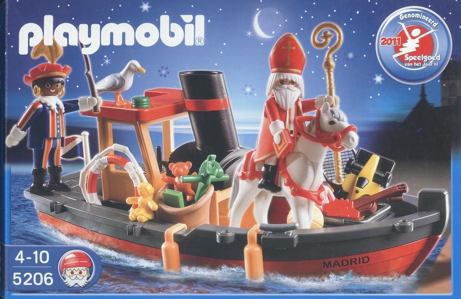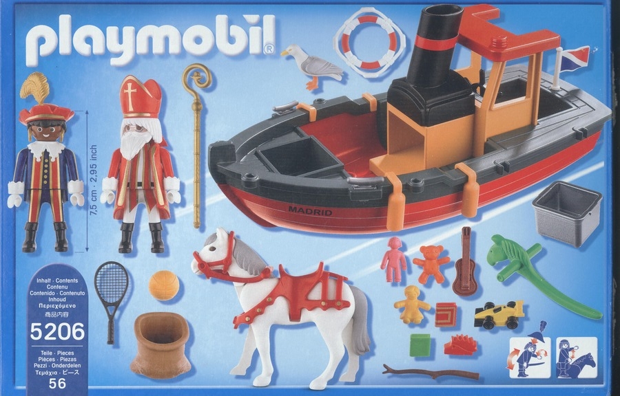 Playmobil set met stoomboot, Sinterklaas, Zwarte Piet, paard, krat, zak met speelgoed, meeuw en reddingsboei