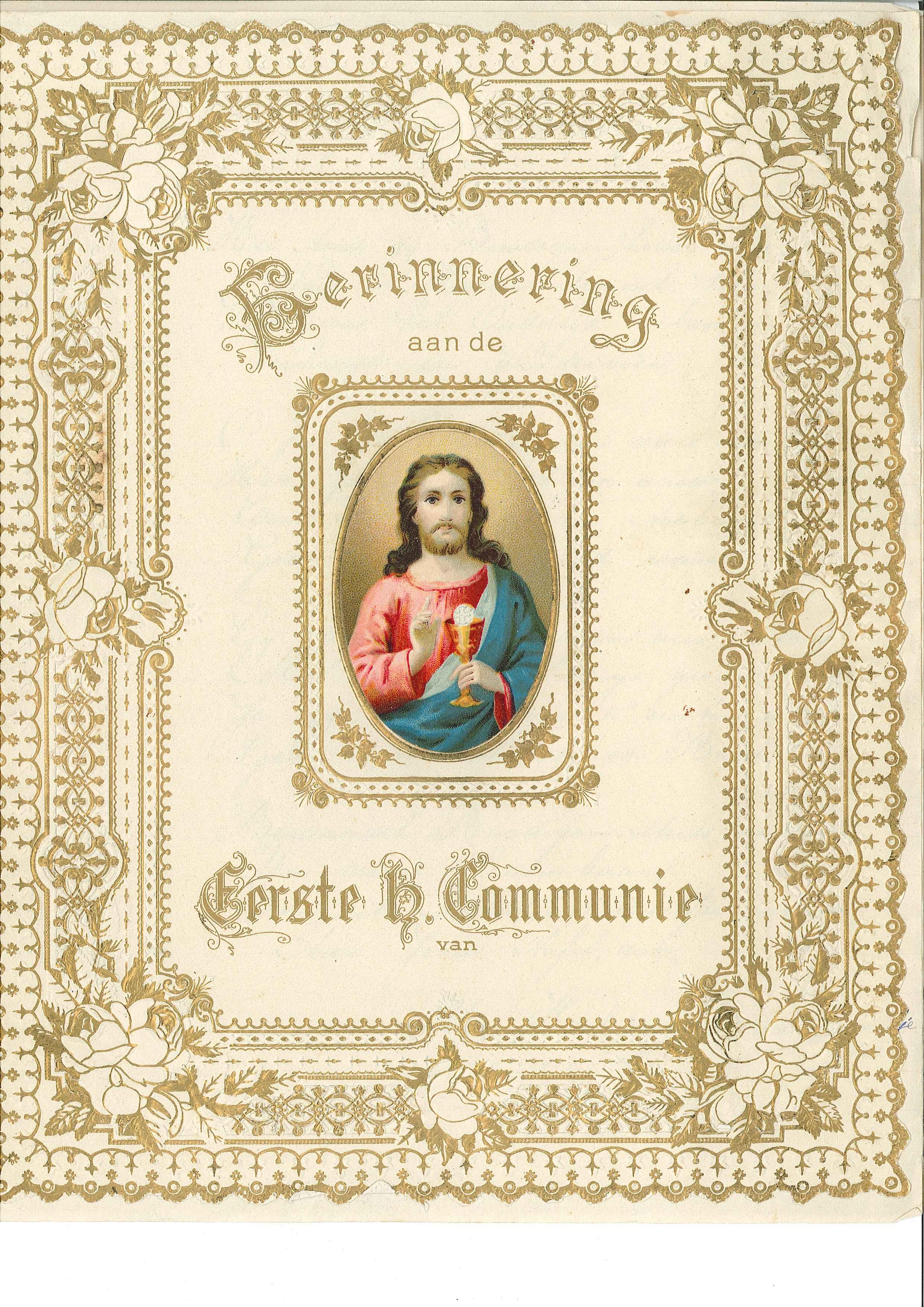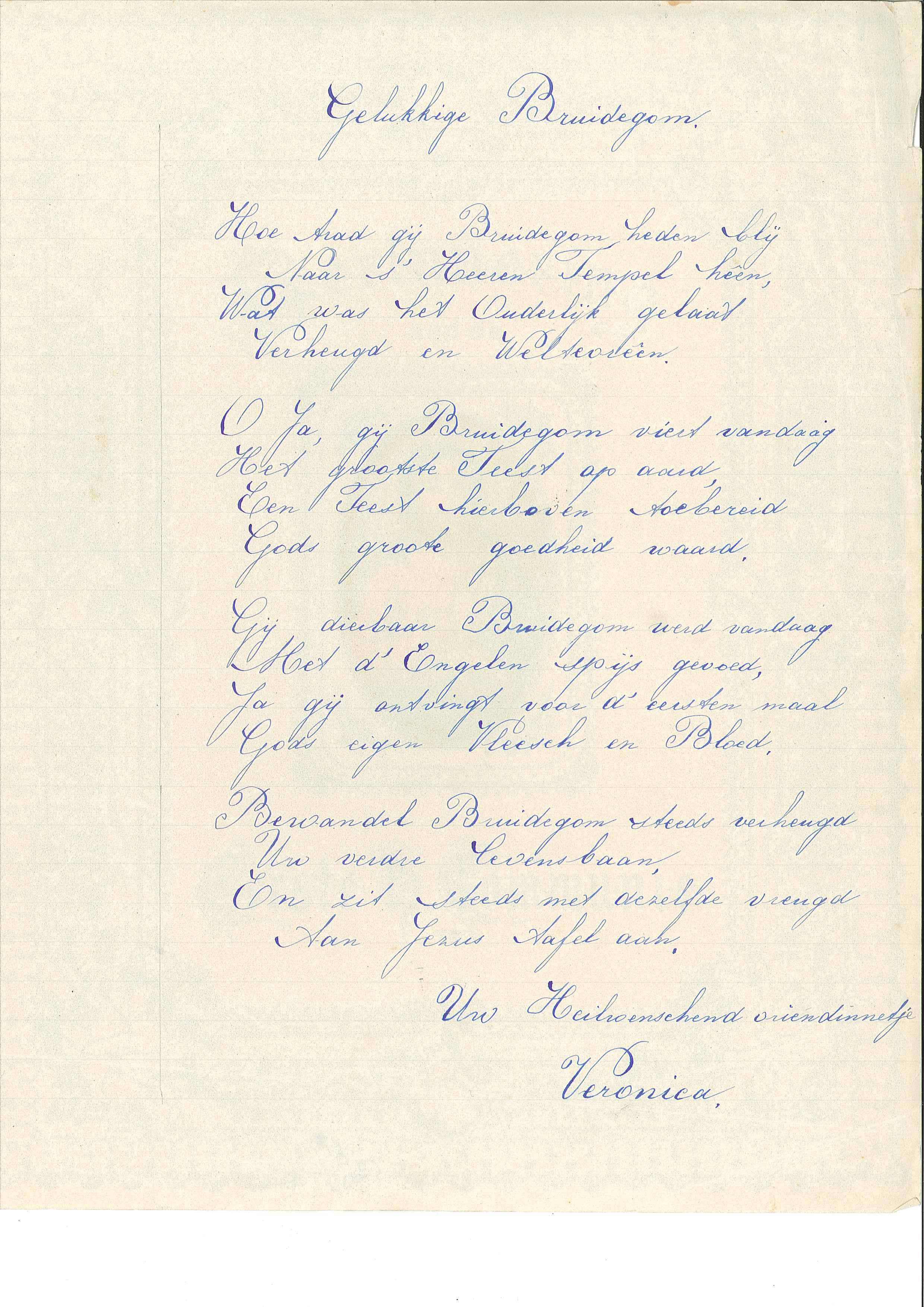 Communiewens bij plechtige H. Communie van Johannes Waldram, opgedragen door zijn vriendinnetje Veronica, met "Gelukkige bruidegom. Hoe trad gij bruidegom heden blij ..."