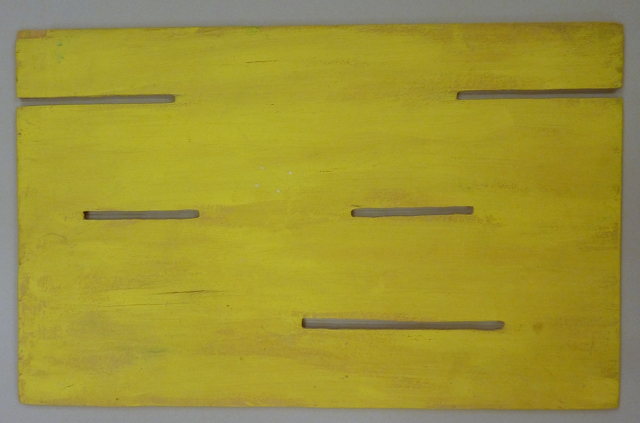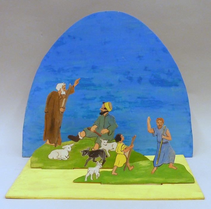 Gefiguurzaagde adventskalender bestaande uit grondplaat, waarin twee plaatjes met figuren en achterplaat gestoken zijn