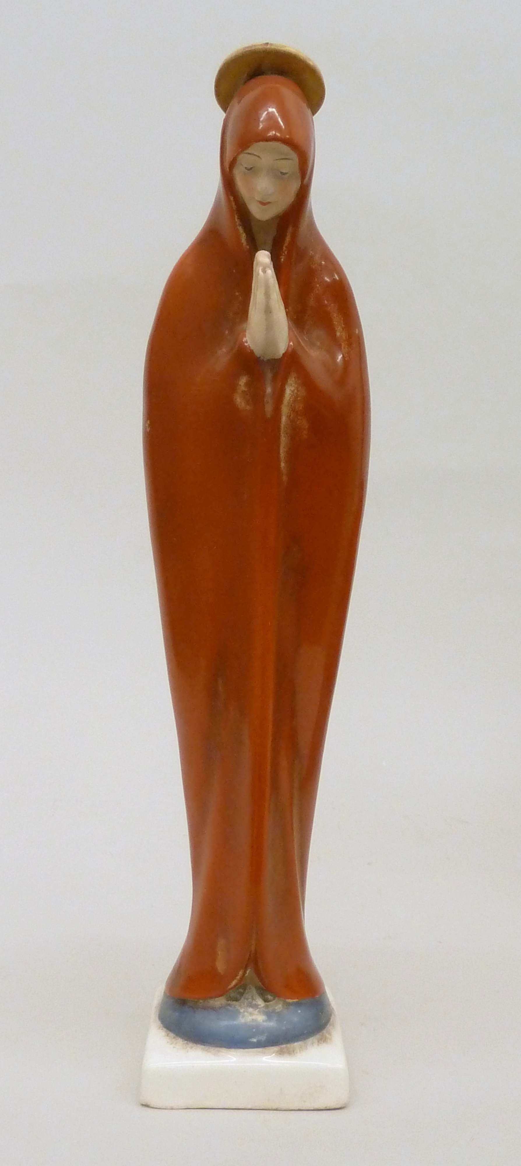 Maria in rood gewaad, met de handen tegen elkaar