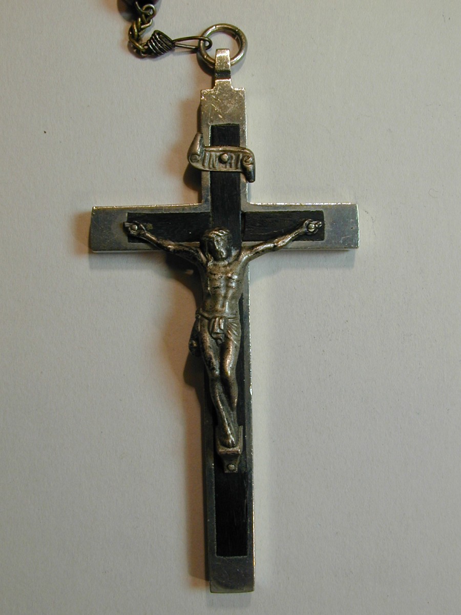 Speelgoedaltaar met toebehoren: rozenkrans van bruine kralen waaraan met zwart ingelegde crucifix