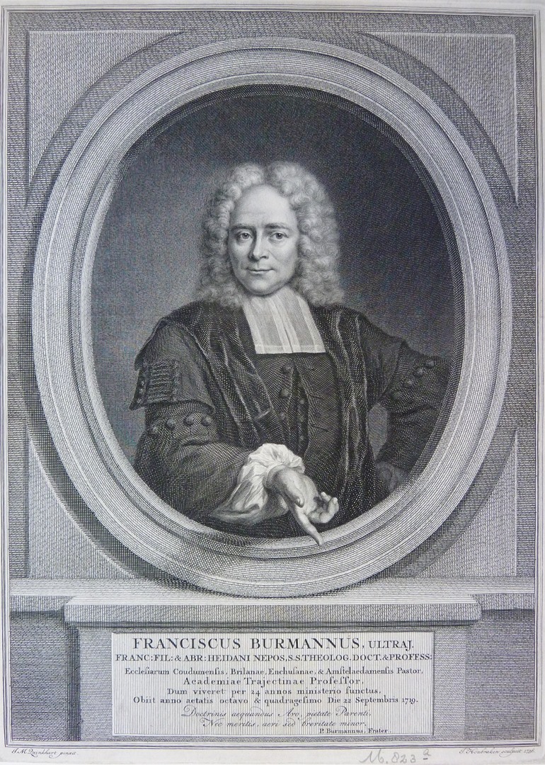 Halffiguur naar voren met rechterhand in wijzend gebaar en linkerhand in de zij. In ovaal. Met zesregelig Latijns onderschrift : 'Franciscus Burmannus ... 1719' en tweeregelig Latijns vers door P. Burmannus (zijn broer): 'Doctrinis ... minor'.