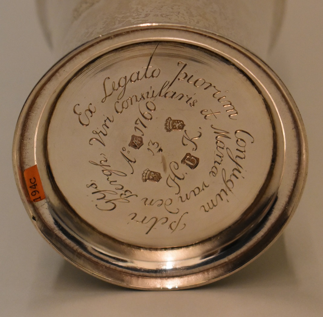 Avondmaalsbeker Hooglandse kerk, met "Ex legato piorum Conjugum Petri Gijs viri Consularis ..."