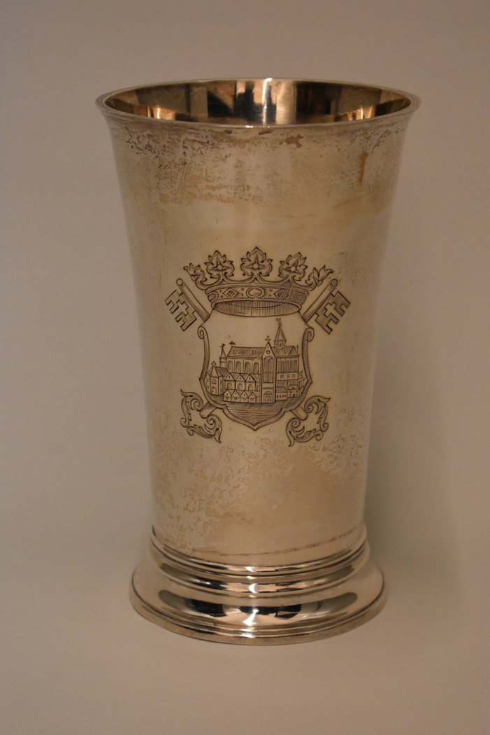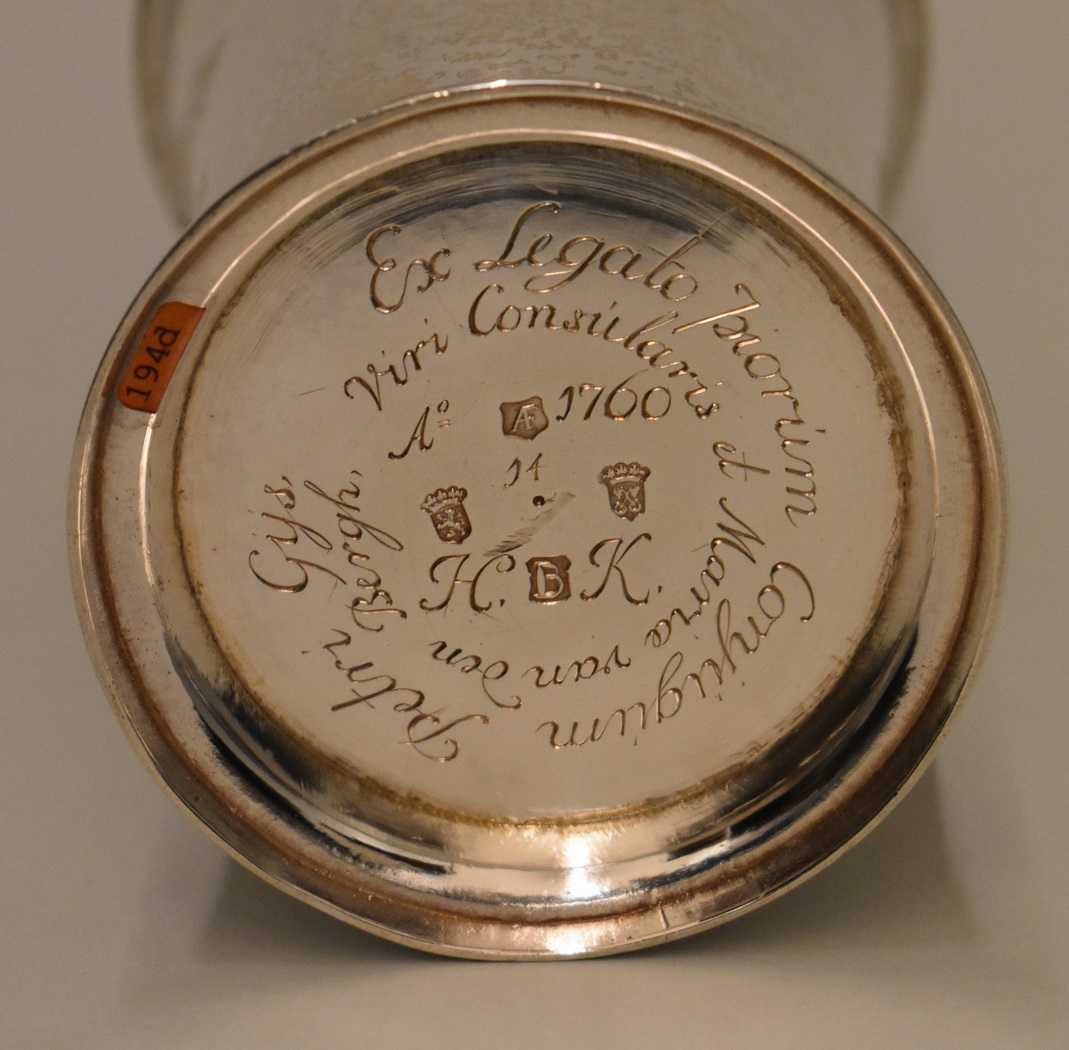 Avondmaalsbeker Hooglandse kerk, met "Ex legato piorum Conjugum Petri Gijs viri Consularis ..."
