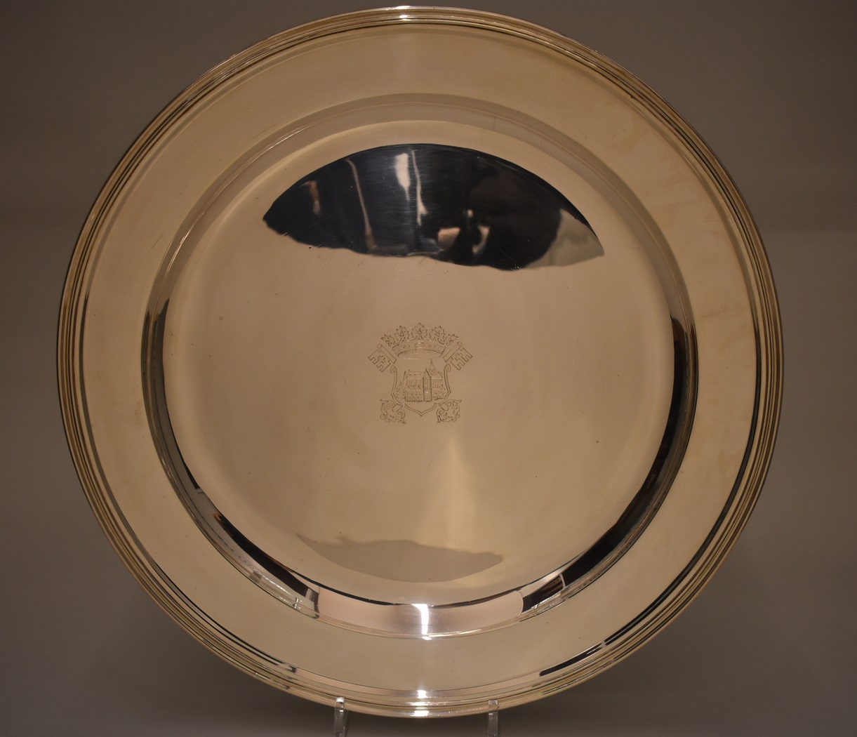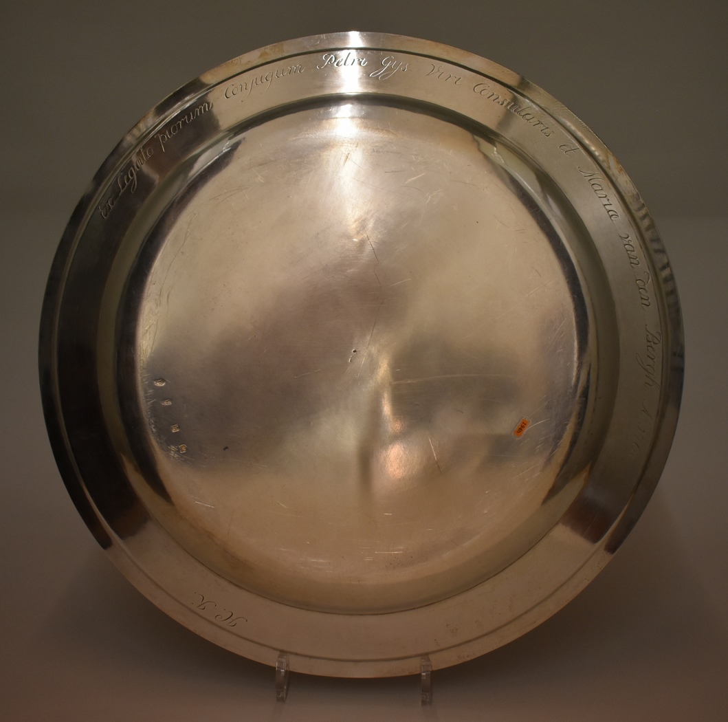 Avondmaalsschotel Hooglandse kerk met wapen Leidse Hoofdkerken, achterop "Ex legato piorum ..."