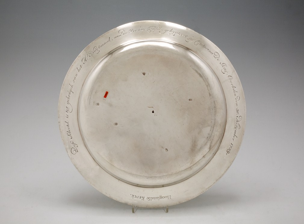 Avondmaalsschotel Hooglandse kerk met wapen Leidse Hoofdkerken en achterop "Dese schootel is tot gebruijck van het H. Nagtmaal, aan de Vrouwe Tafel, gelegateert bij Catarina de Jong, overleden den 30. november 1739."