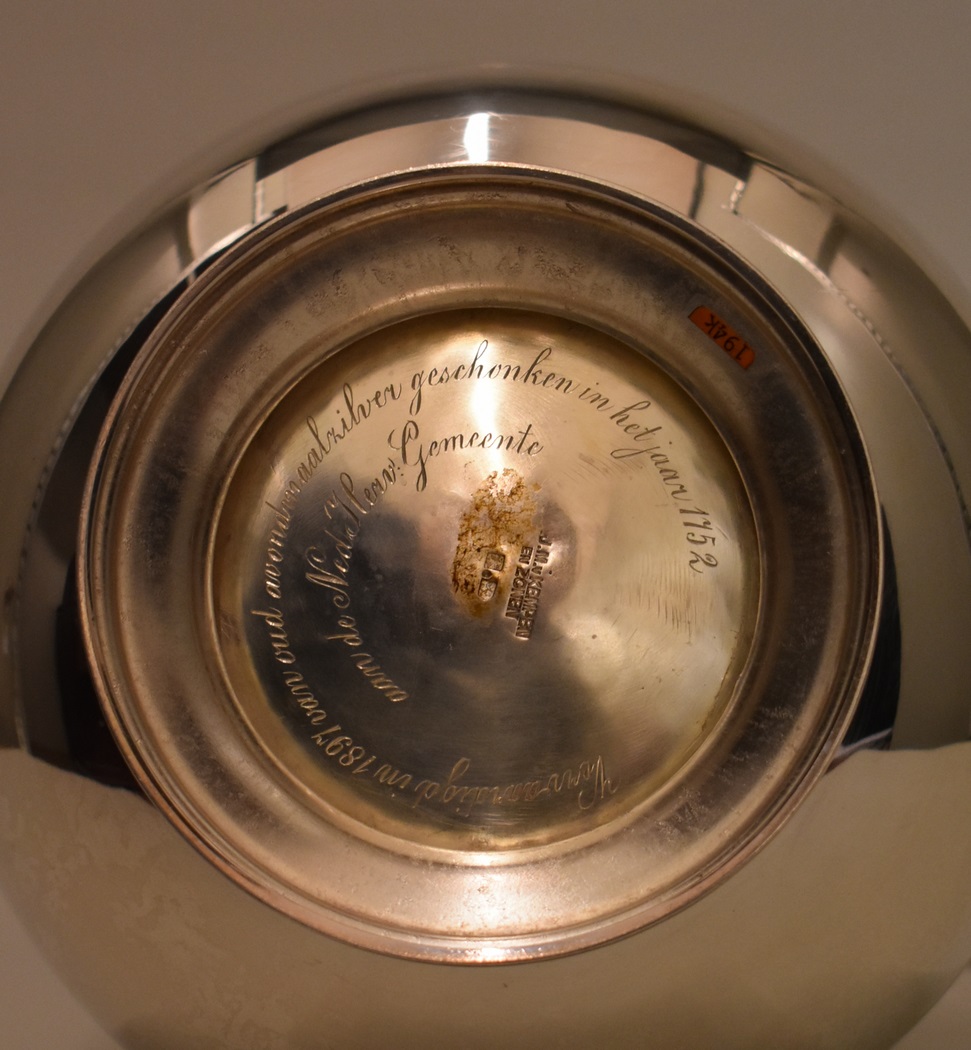 Avondmaalskan Hooglandse kerk met schelpvormige klephouder, met wapen Leiden, inscriptie