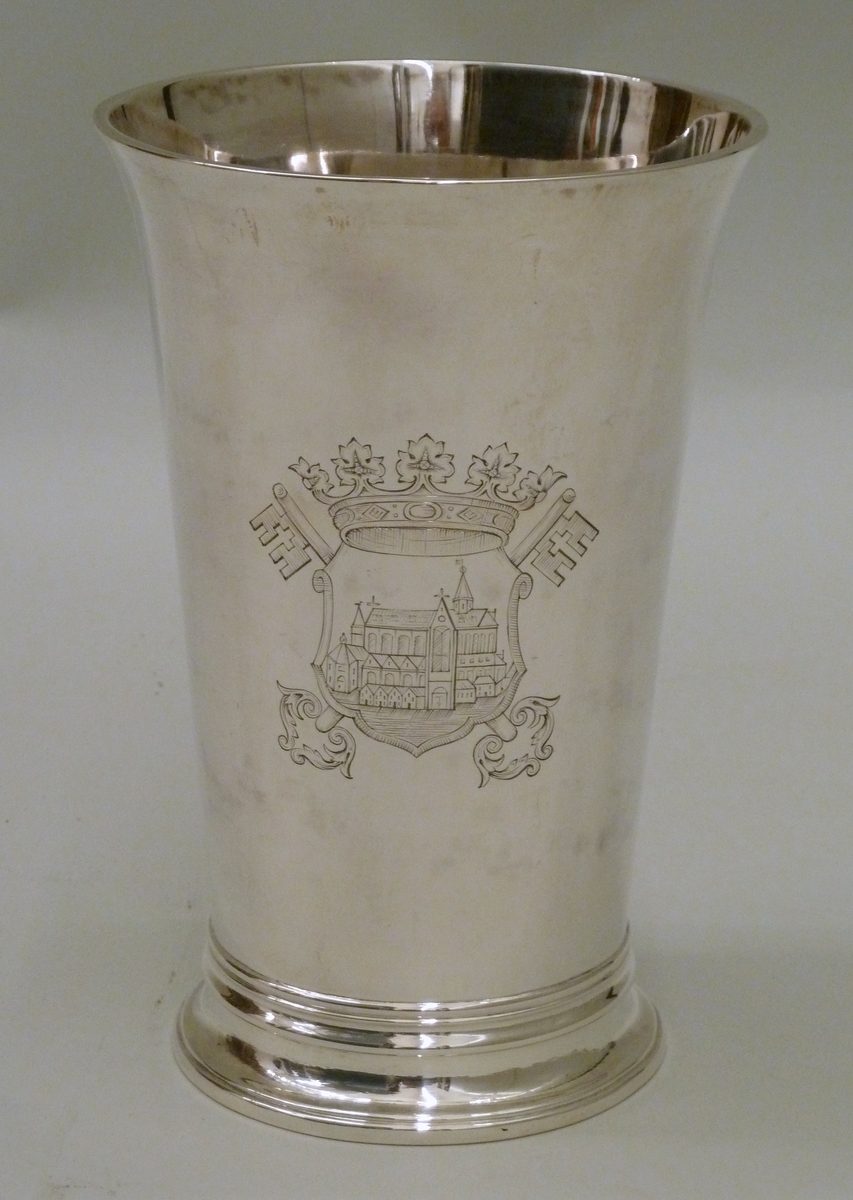 Avondmaalsbeker Marekerk met wapen Leidse Hoofdkerken, onderop "Den ... 1755 ... Marekerck"