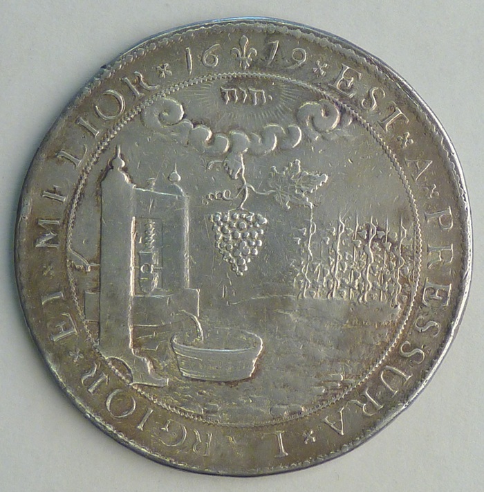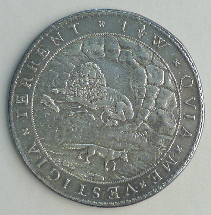 Penning op godsdiensttwisten met vos, leeuw in grot, kz. druiventros, wijnpers en tekst, 1619