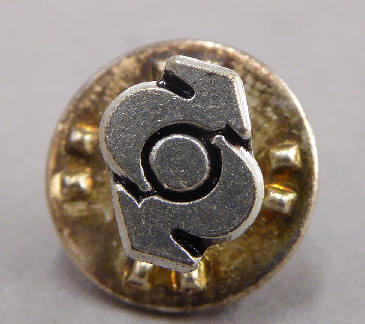 Zilverkleurige reversspeld met embleem van het ICTO; twee pijlen, elk anders gericht