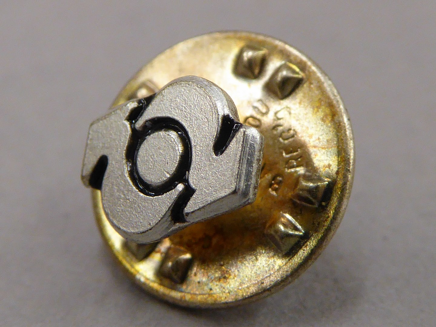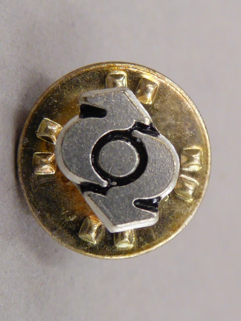Zilverkleurige reversspeld met embleem van het ICTO; twee pijlen, elk anders gericht