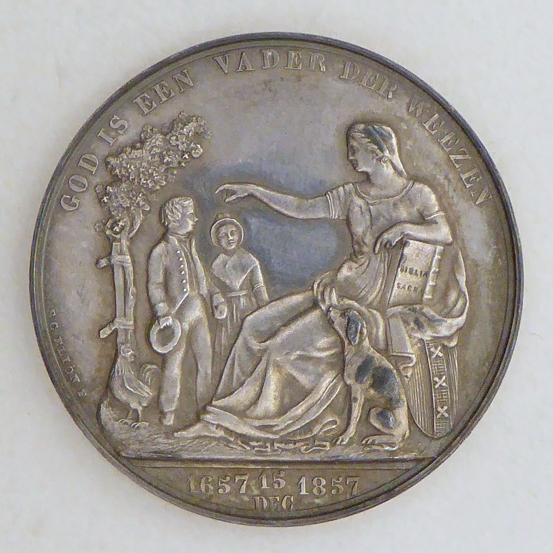 Penning diakonie met "Dia. Weeshuis der Ned. ... Amsterdam", kz. beschermvrouwe, wezen, "1657 1857"