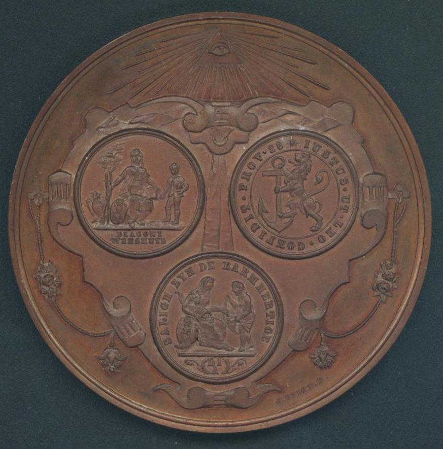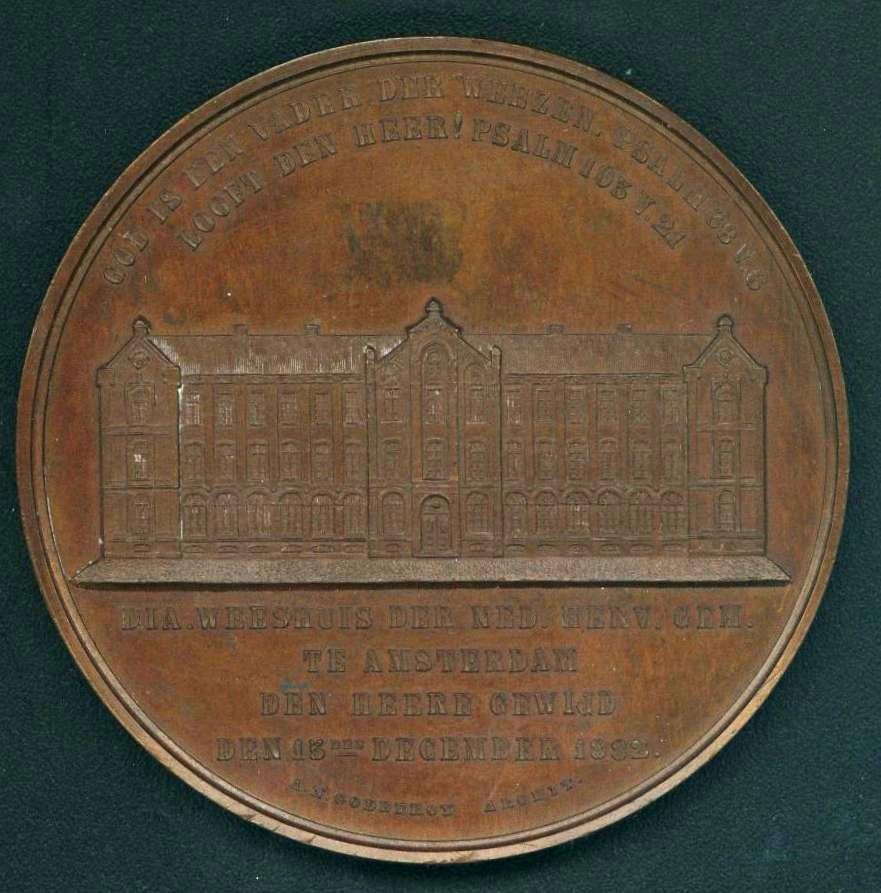 Penning diakonie met drie tekstschildjes en Alziend Oog, kz. "Dia. Weeshuis ... Amsterdam ..."