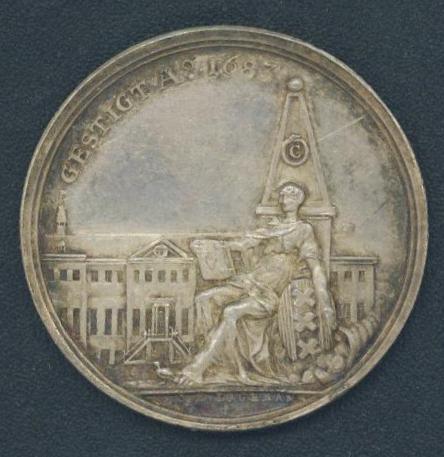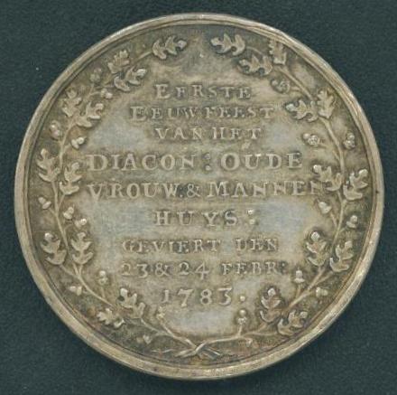 Penning diakonie met "Gestigt Ao. 1683", kz. met "Eerste eeuwfeest van het Diacon. Oude Vrouw. & Mannenhuys geviert den 23 & 24 febr. 1783"