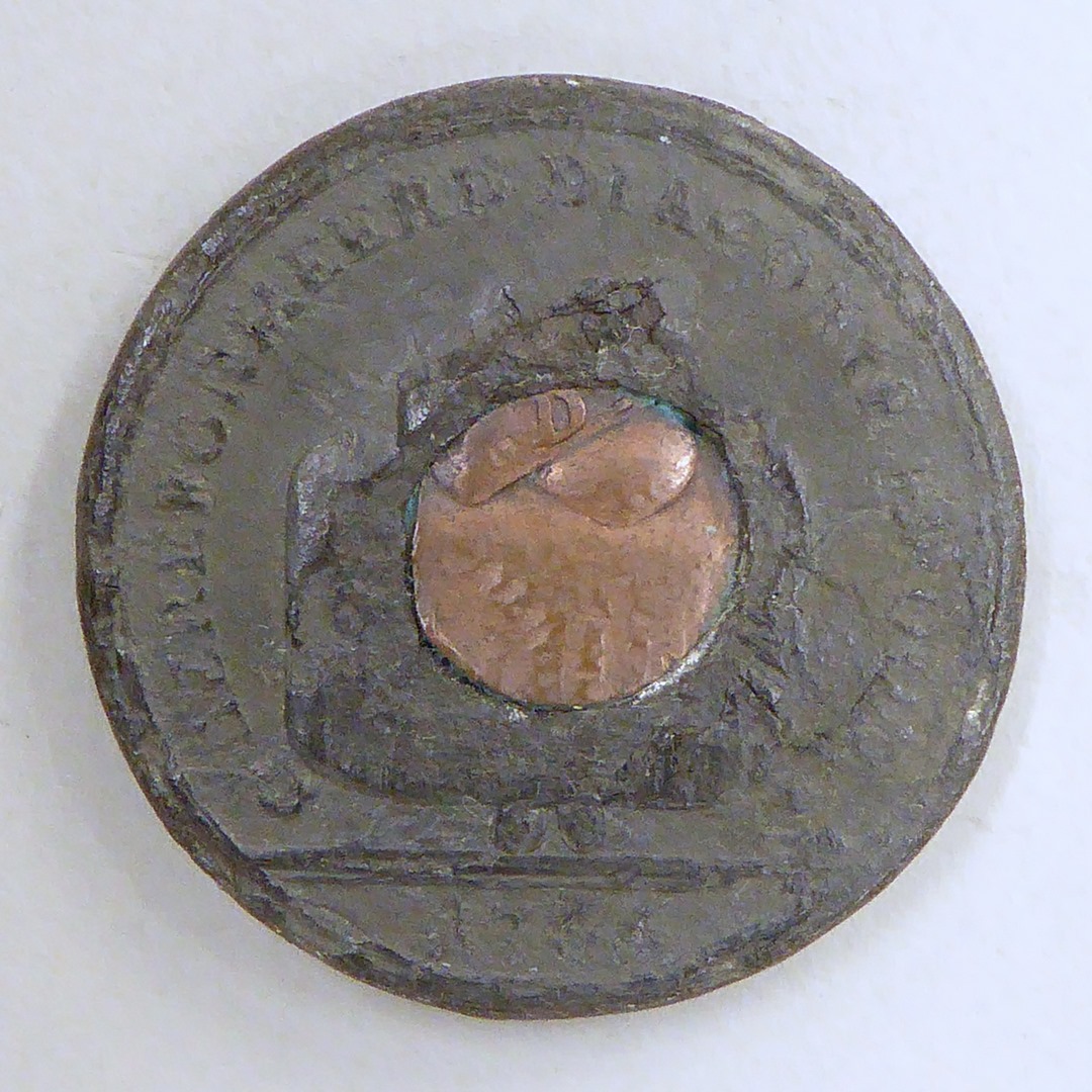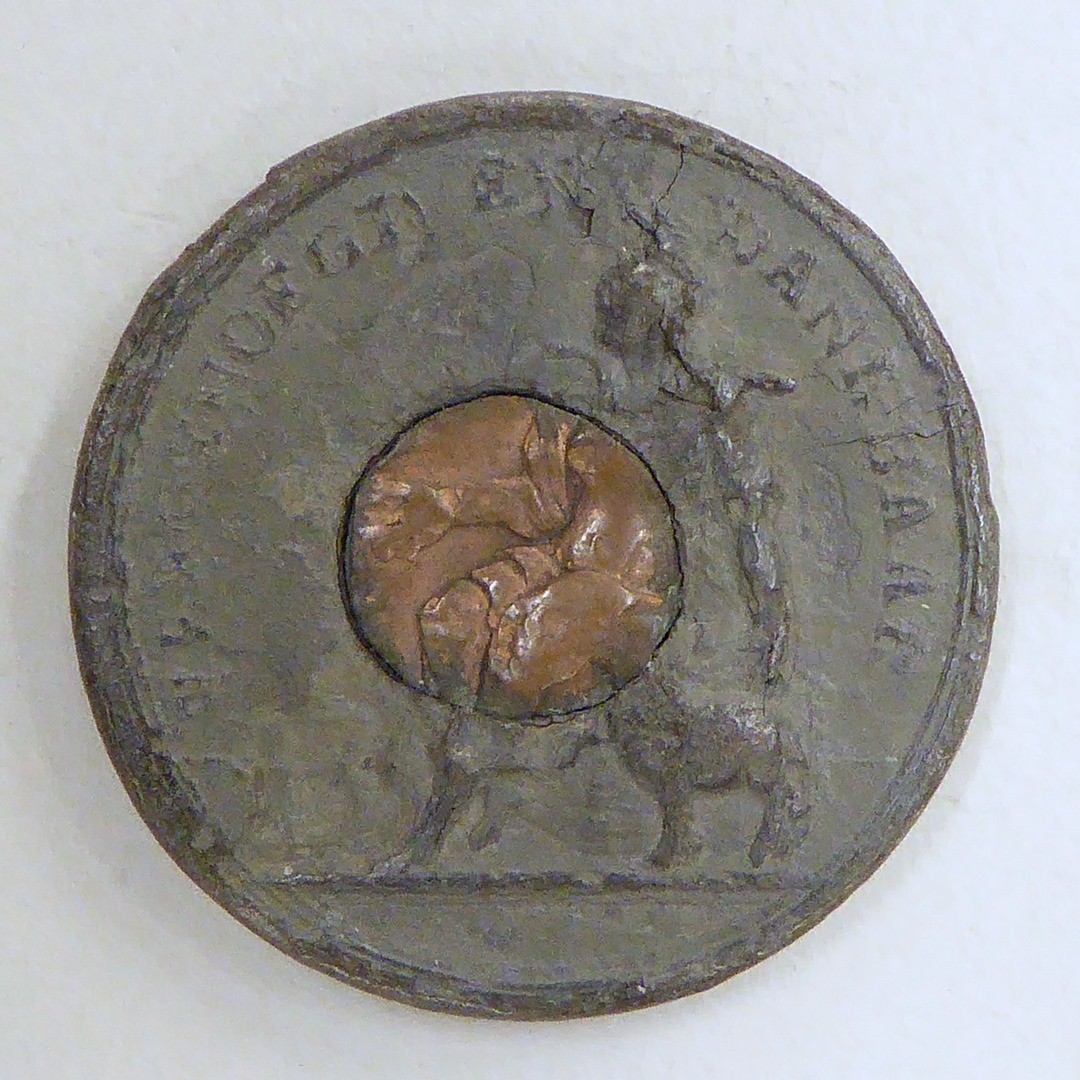 Broodpenning Amsterdam met koperen plug, met zittende Barmhartigheid met lam en met "vergenoegd en dankbaar", kz. twee broden op afgerokte tafel met "Gereformeerd Diaconie brood 1766"