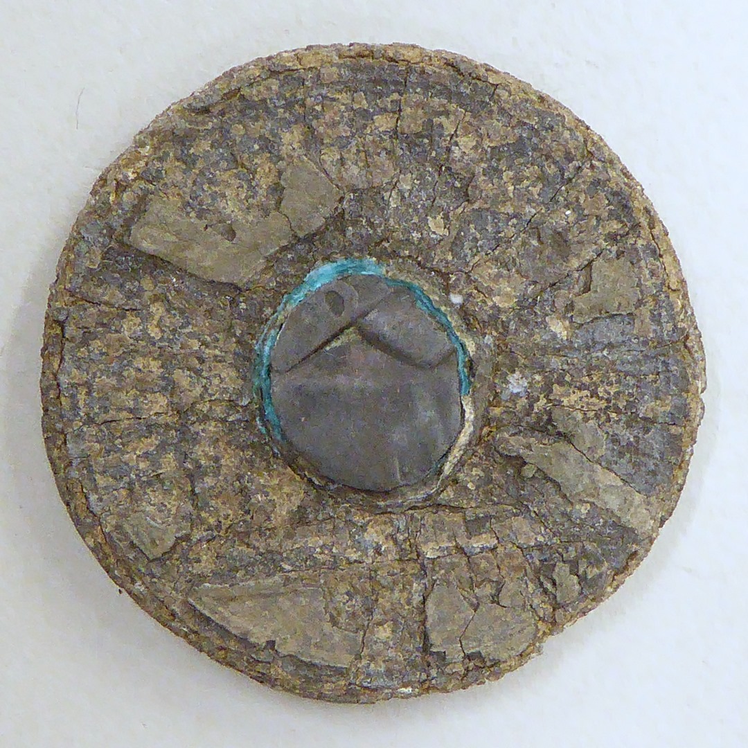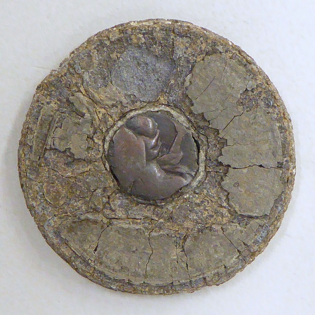 Broodpenning Amsterdam met koperen plug, als SPKK m213a(?), onleesbaar gehavend oppervlak