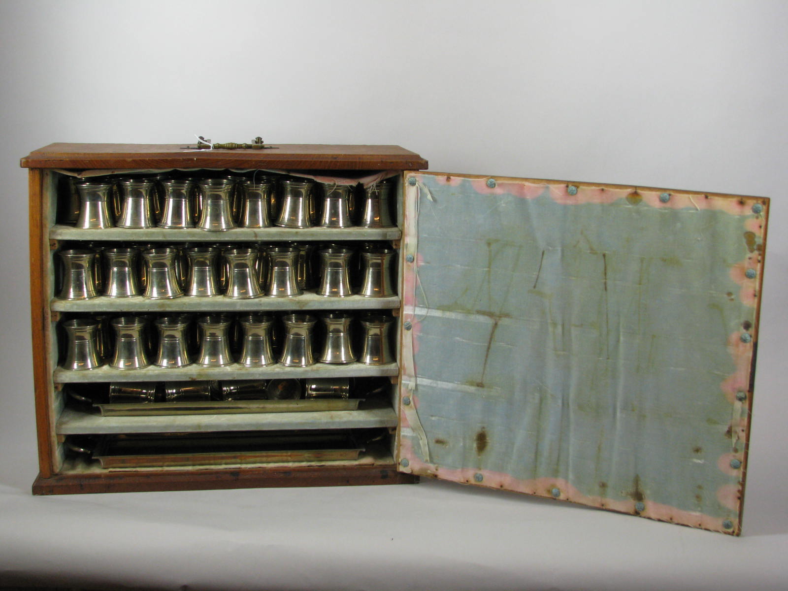 Kastje gemaakt voor avondmaalsbekertjes en twee avondmaalsschalen met "Diaconie Herv: Gem: Warder."