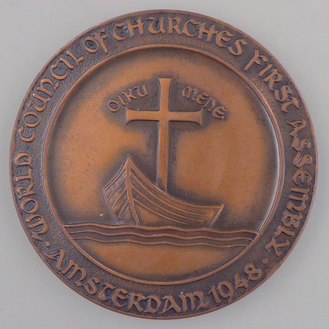 Penning op de vergadering van de Wereldraad van Kerken met "World Council of Churches First Assembly Amsterdam 1948" rondom scheepje waarin kruis met "oikumene", kz. kruisvaan met "Man's disorder and God's Design"