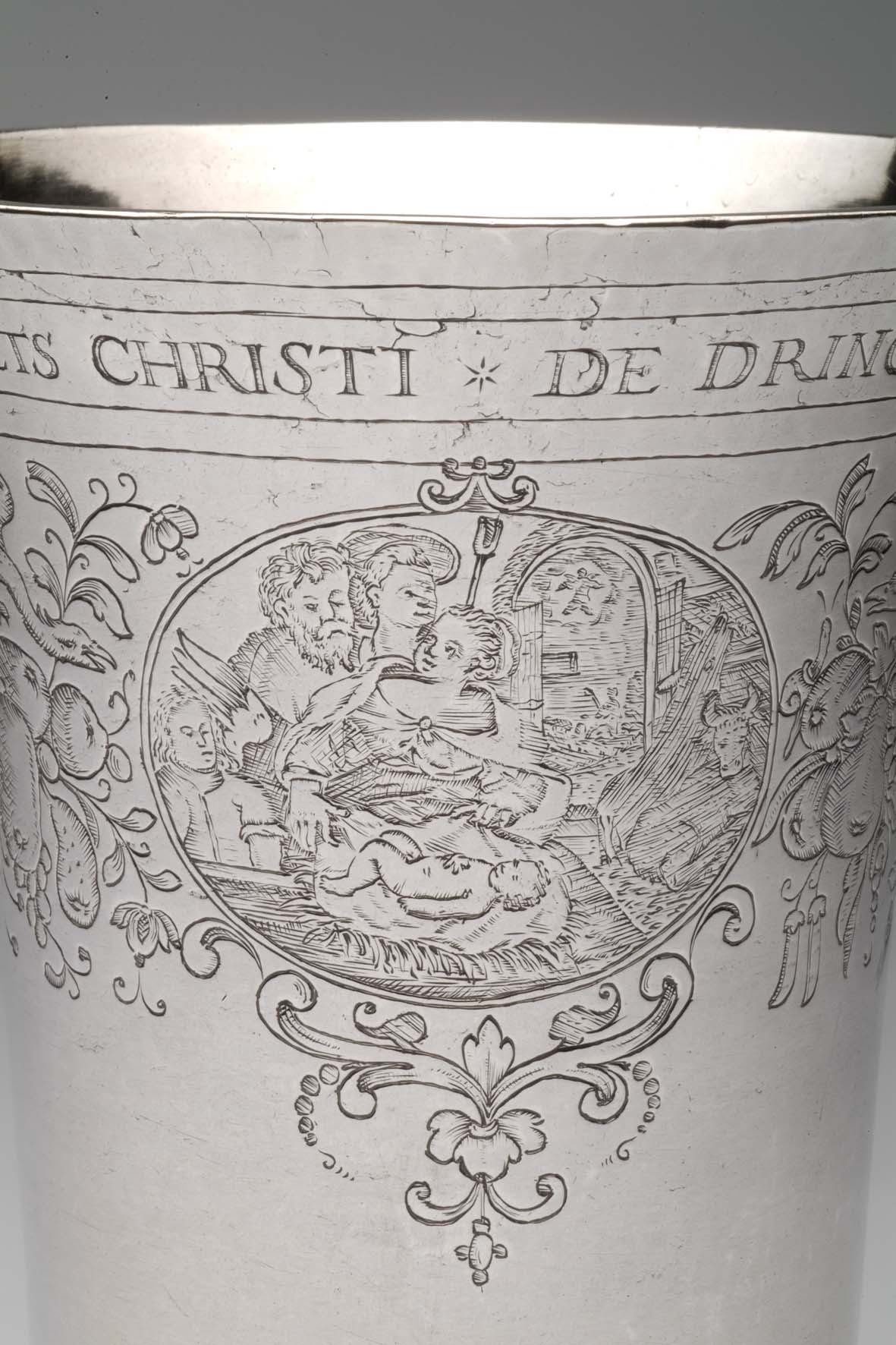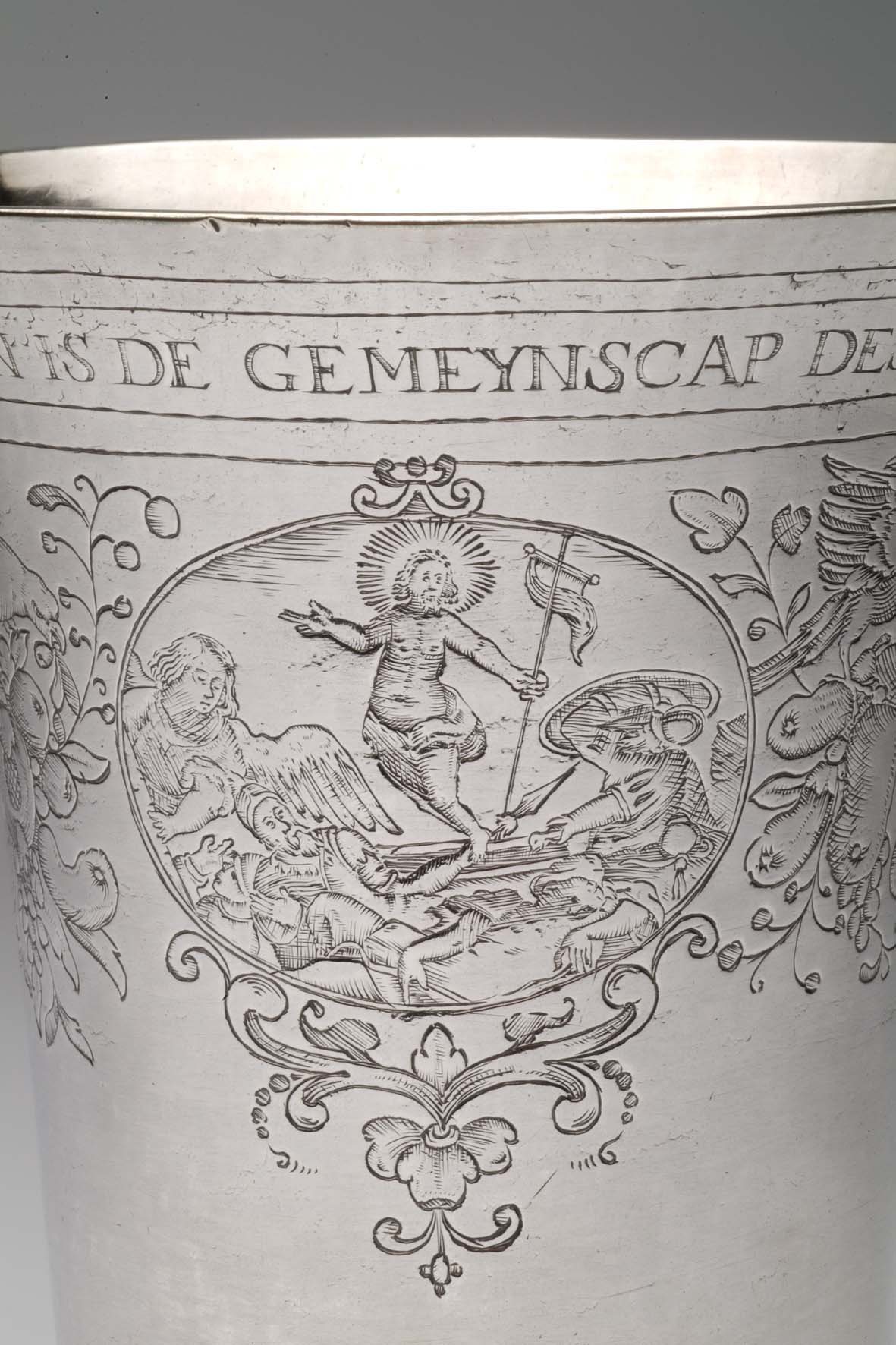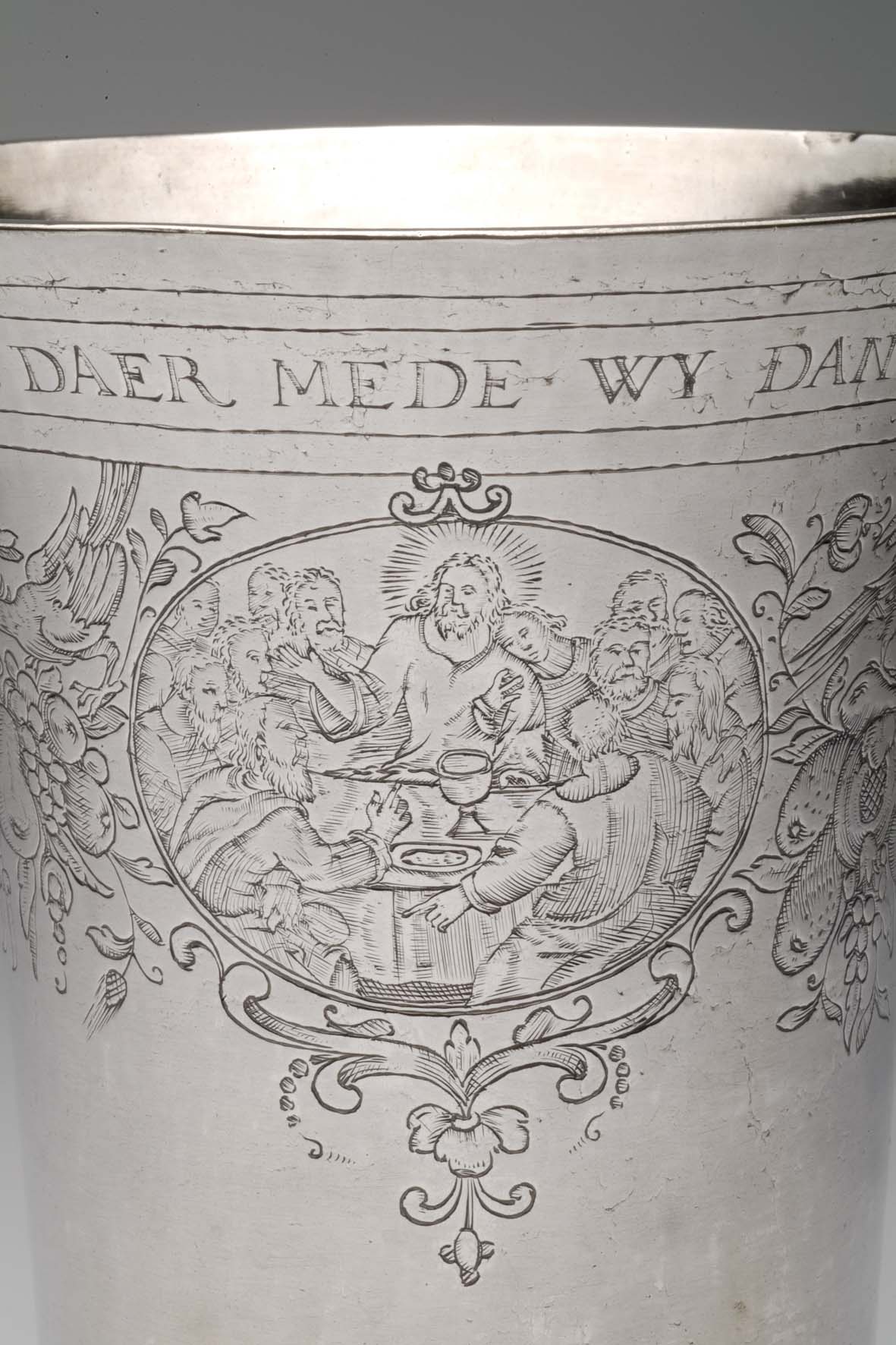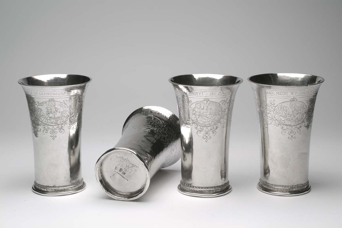 Avondmaalsbeker met onderaan bovenrand "De drincbeker ... des bloets Christi" waaronder drie ovale medaillons met de geboorte, het laatste avondmaal en de verrijzenis van Christus