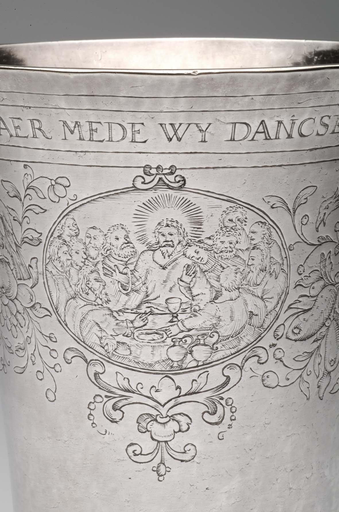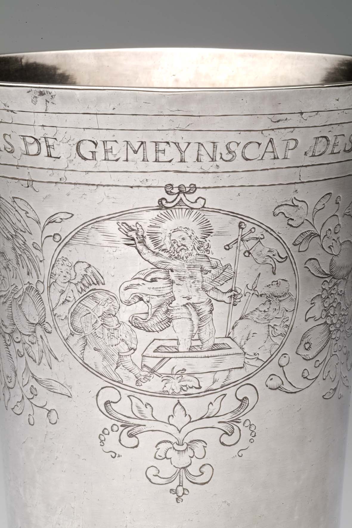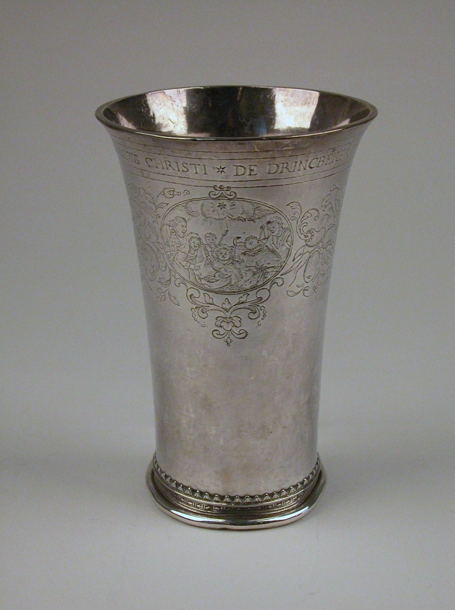 Avondmaalsbeker met onderaan bovenrand "De drincbeker ... des bloets Christi" waaronder drie ovale medaillons met de geboorte, het laatste avondmaal en de verrijzenis van Christus